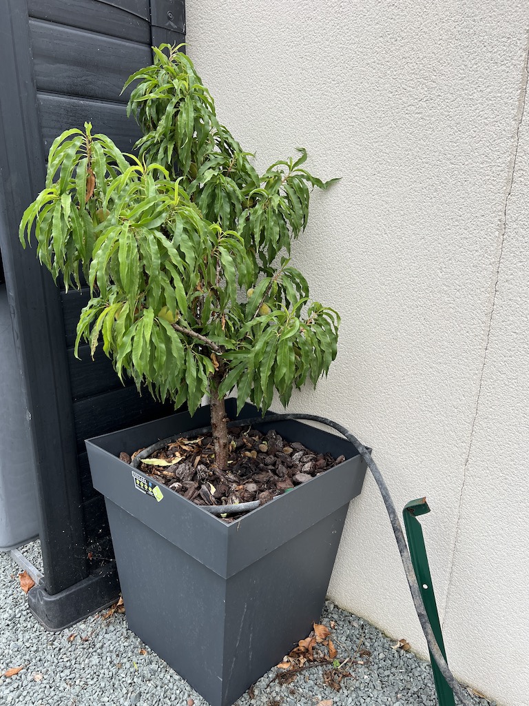 J'ai chez moi un pêcher nain depuis un peu pls d'un an. L'été dernier il n'a donné que 3 fruits mais de petite taille. Depuis il a été rempoté dans un grand pot de 50 cm, il est orienté SE, contre un mur à l'abri du vent , paillé avec de l'écorce de pin, etc..