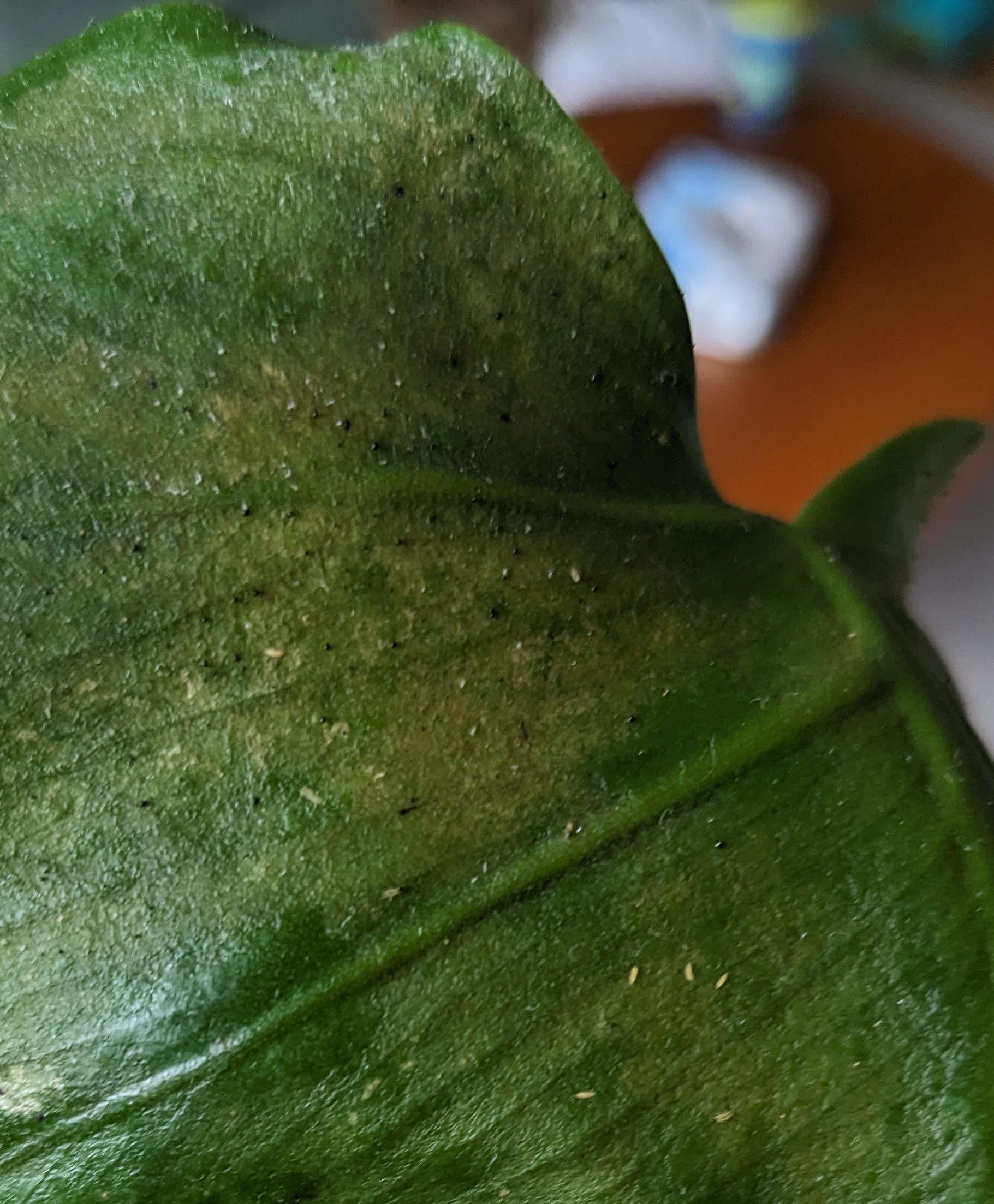 Des parasites (noirs et d'autres plutôt allongés blancs) semblent avoir infectés les feuilles. Photos ci joint