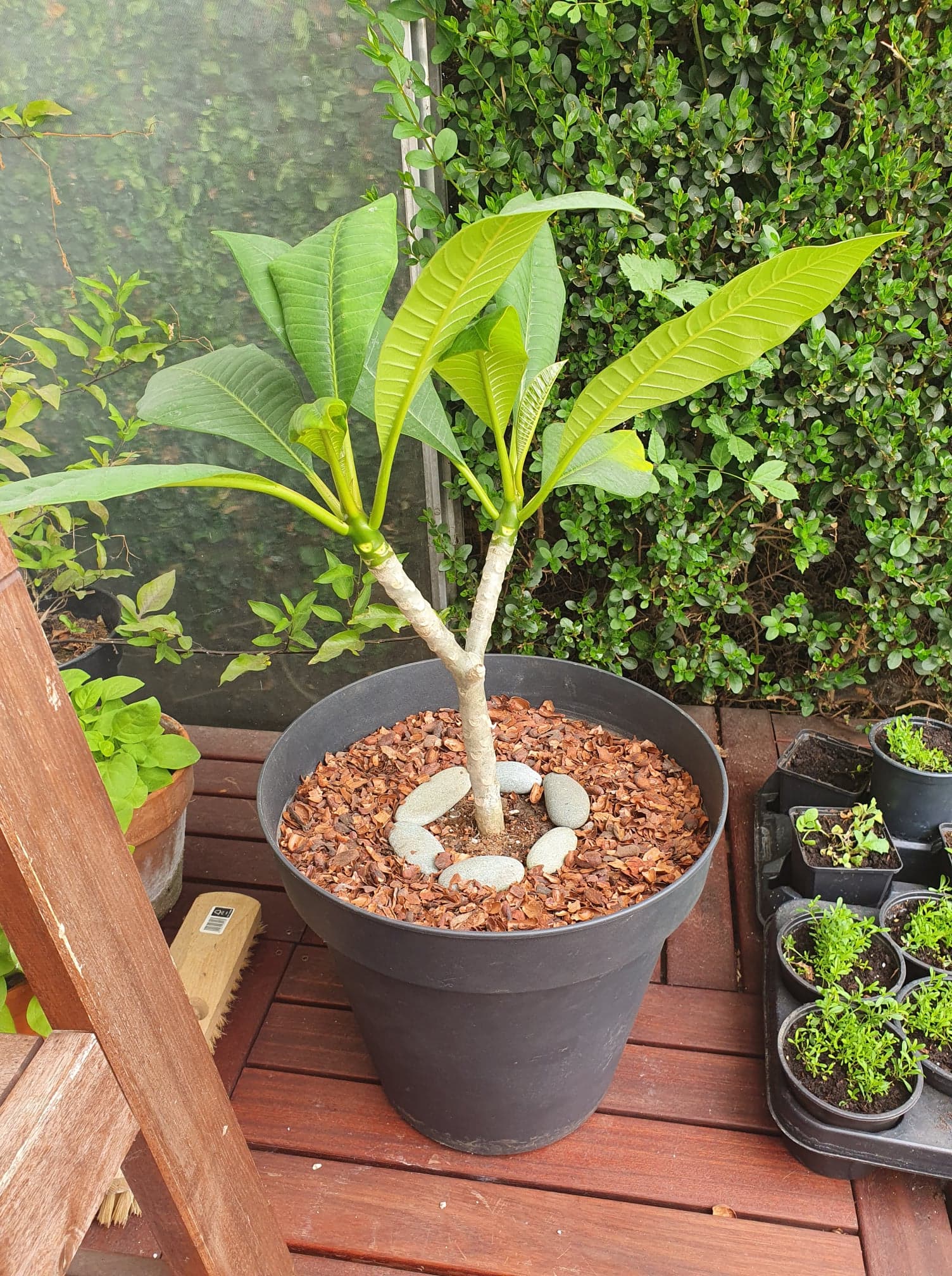 Bonjour. Merci beaucoup pou votre réponse rapide. J'ai rempoté le frangipanier dans un pot plus grand et en ajoutant de la terre de mon jardin (argileuse). j'y ai aussi ajouté un peu de gravier pour le drainage. je n'ai pas de mulch donc j'ai mis une couche de cosses de cacao en prenant soin de ne pas les coller au tronc. Pensez-vous que c'est plus correct comme ça ?