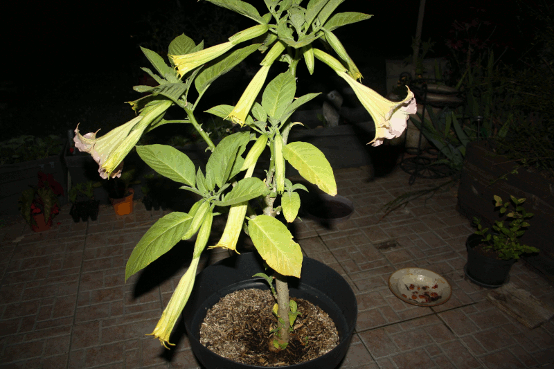 C'est la première fois que je vois fleurir mes brugmensia avant octobre. J'en croyais pas mes yeux.Il y a encore des fleurs a venir.