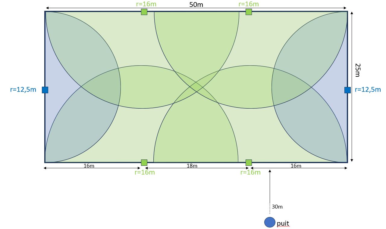 Comme illustré sur le plan en pièce jointe, je commençais ma réflexion avec des arroseurs rolland 11S sur les largeurs (besoin d’un rayon de 12.5m) et des 17S sur les longueurs (un rayon de 16m me permet de couvrir 100% de la carrière).