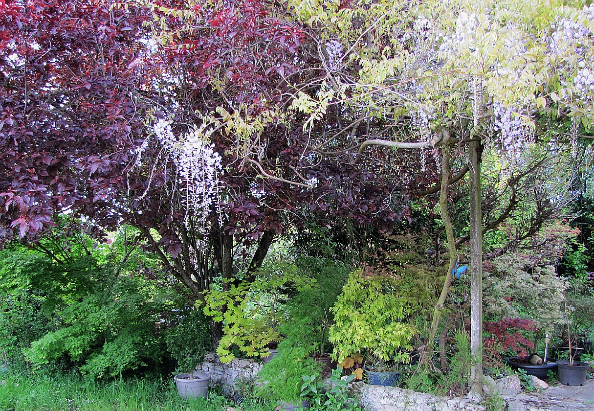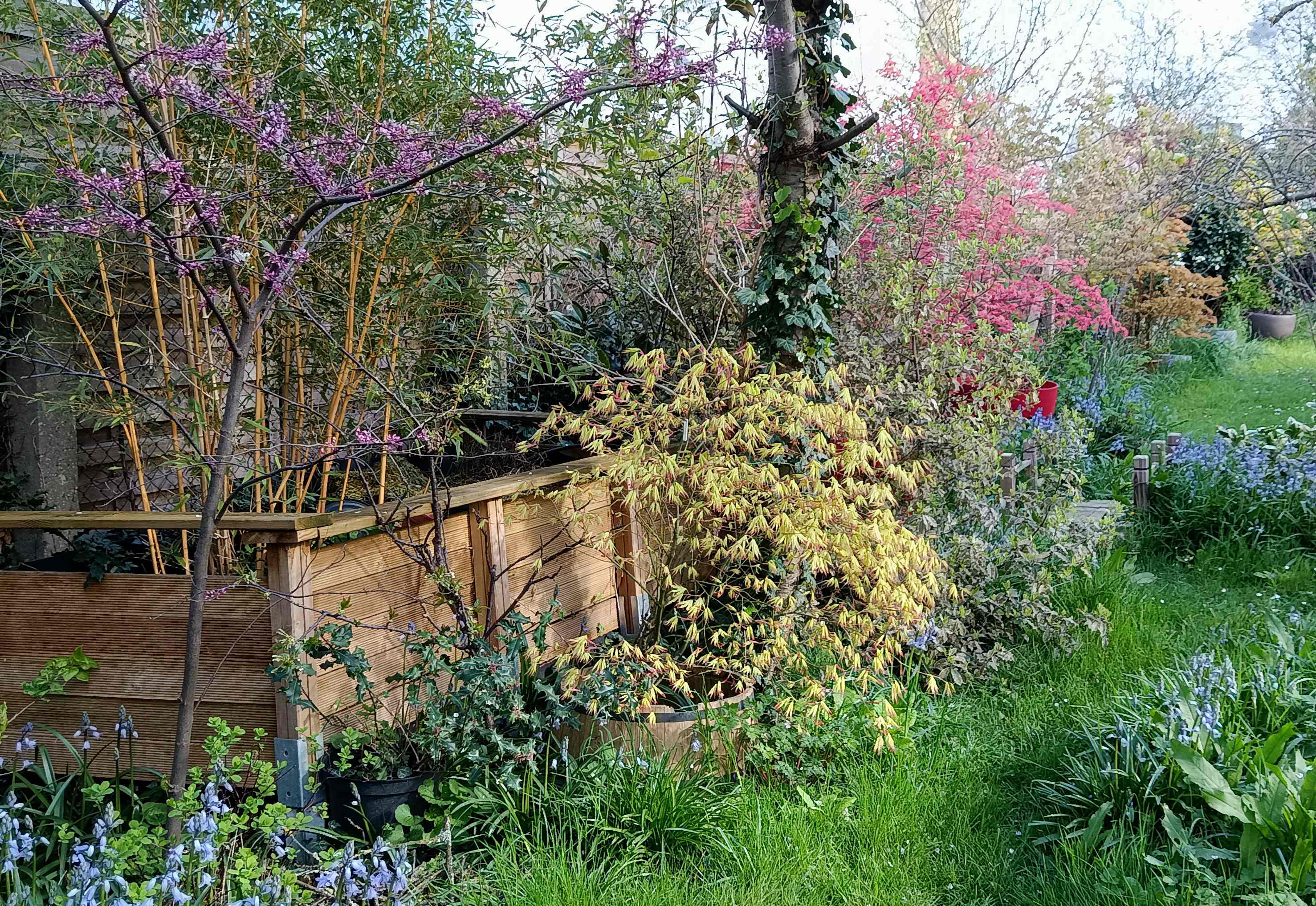 Reticulatum bien jaune pétant au milieu, accompagné d un théier tout en fleurs blanches depuis 2 semaines et d un deshojo devenu trop grand pour le pot, a mettre en pleine terre Poirier William et phoenix Cerisier du Japon amanogawa et un beau cerise pour tropembourg Prunus cocinella, un superbe Rouge violet et un semis de Kyoto d un vert tendre lumineux Zoom Peach and cream, a ses pieds des clochettes bleues On voit mieux Peach and cream, les clochettes au sol, a gauche le cercis alley cat tout violet, et au fond un shindeshojo bien rose. Un pittosporum blanc et des bambous jaune donne une belle allure a ce massif Béni maiko et ses clochettes, Bonne journée à vous