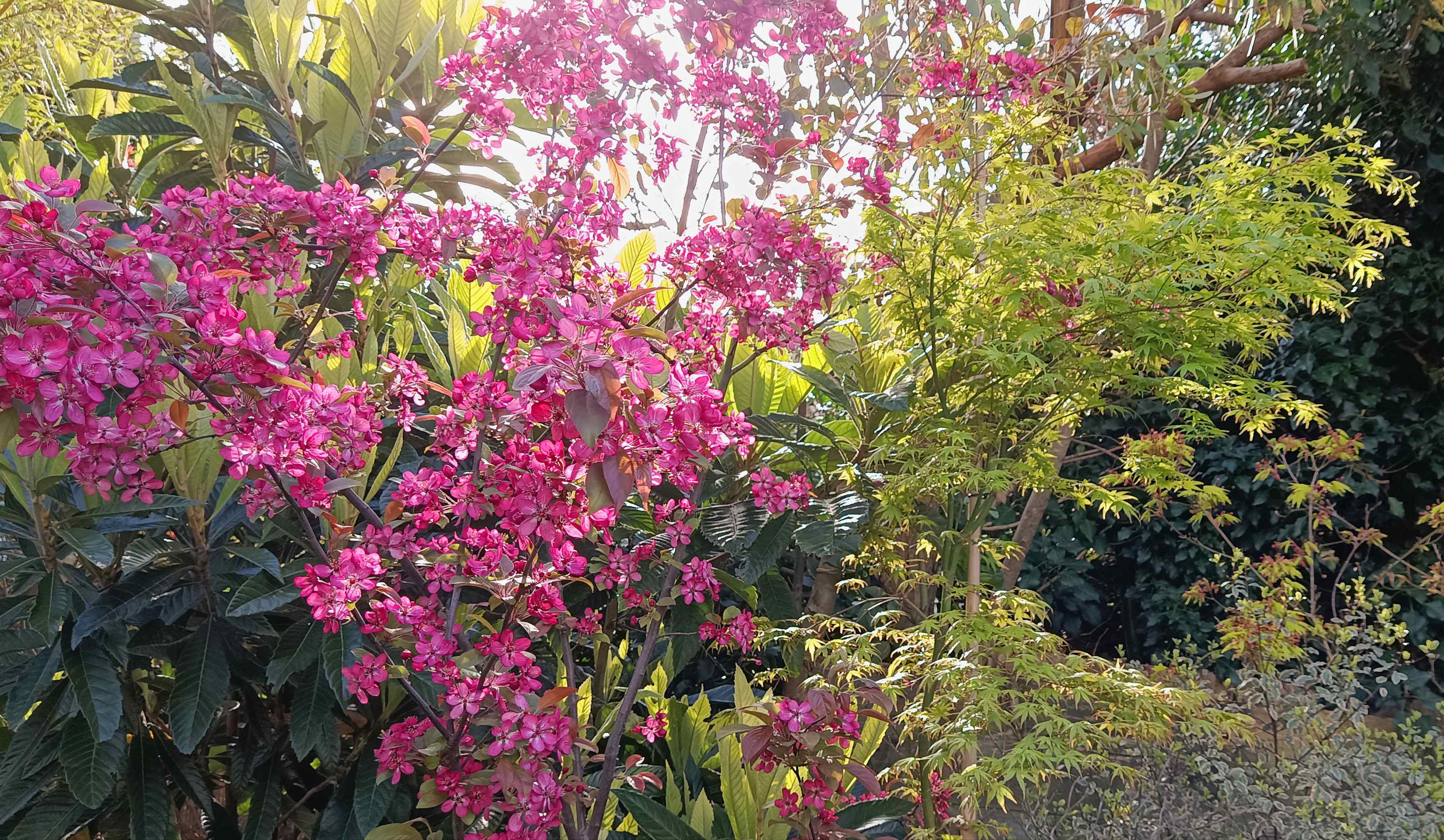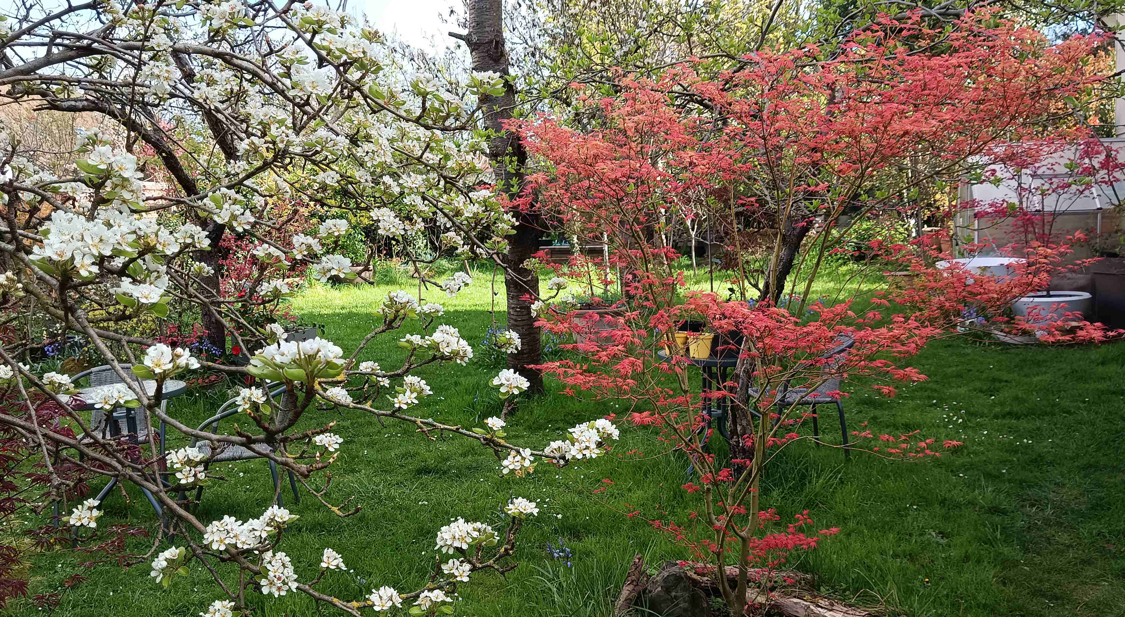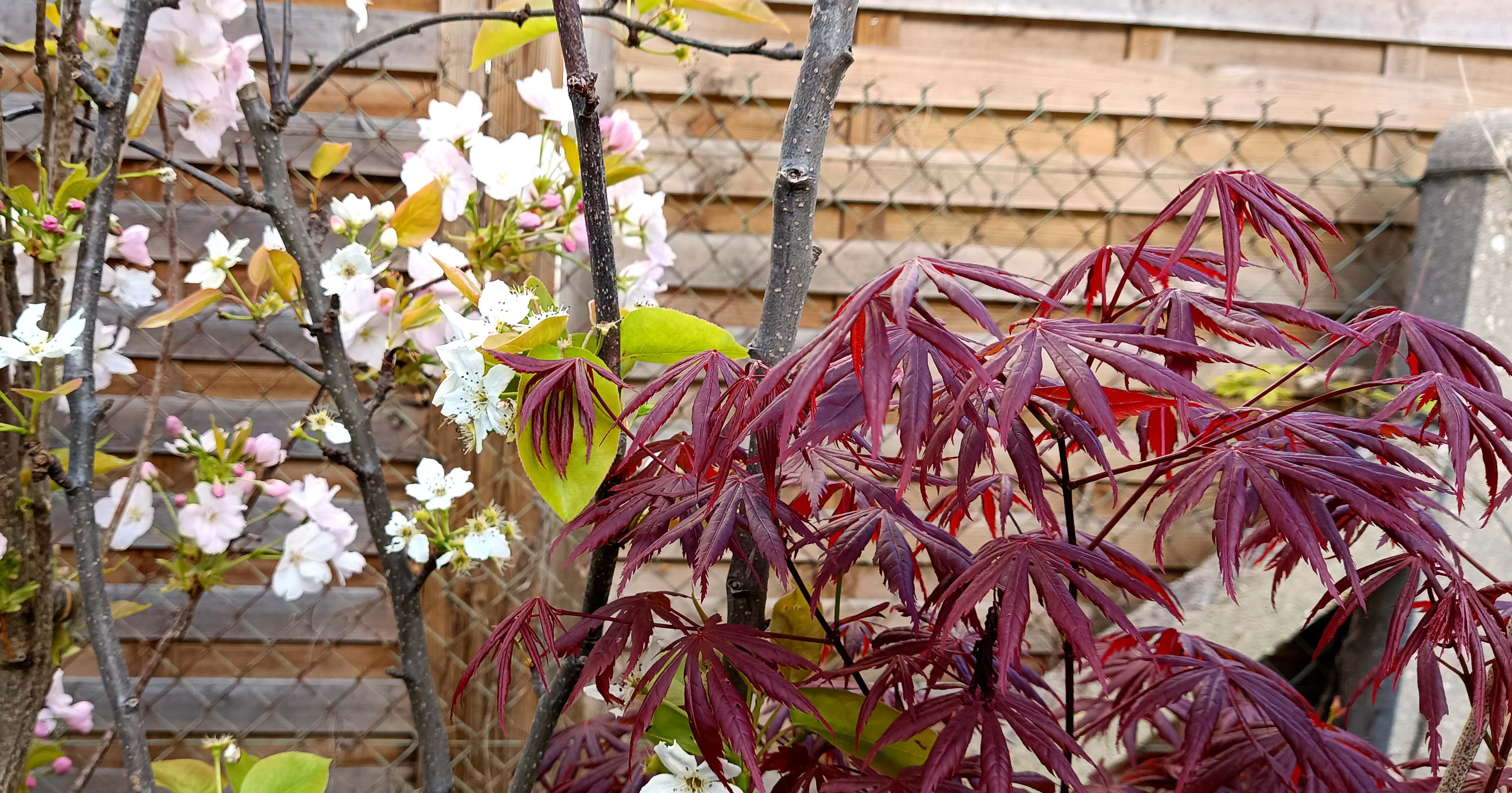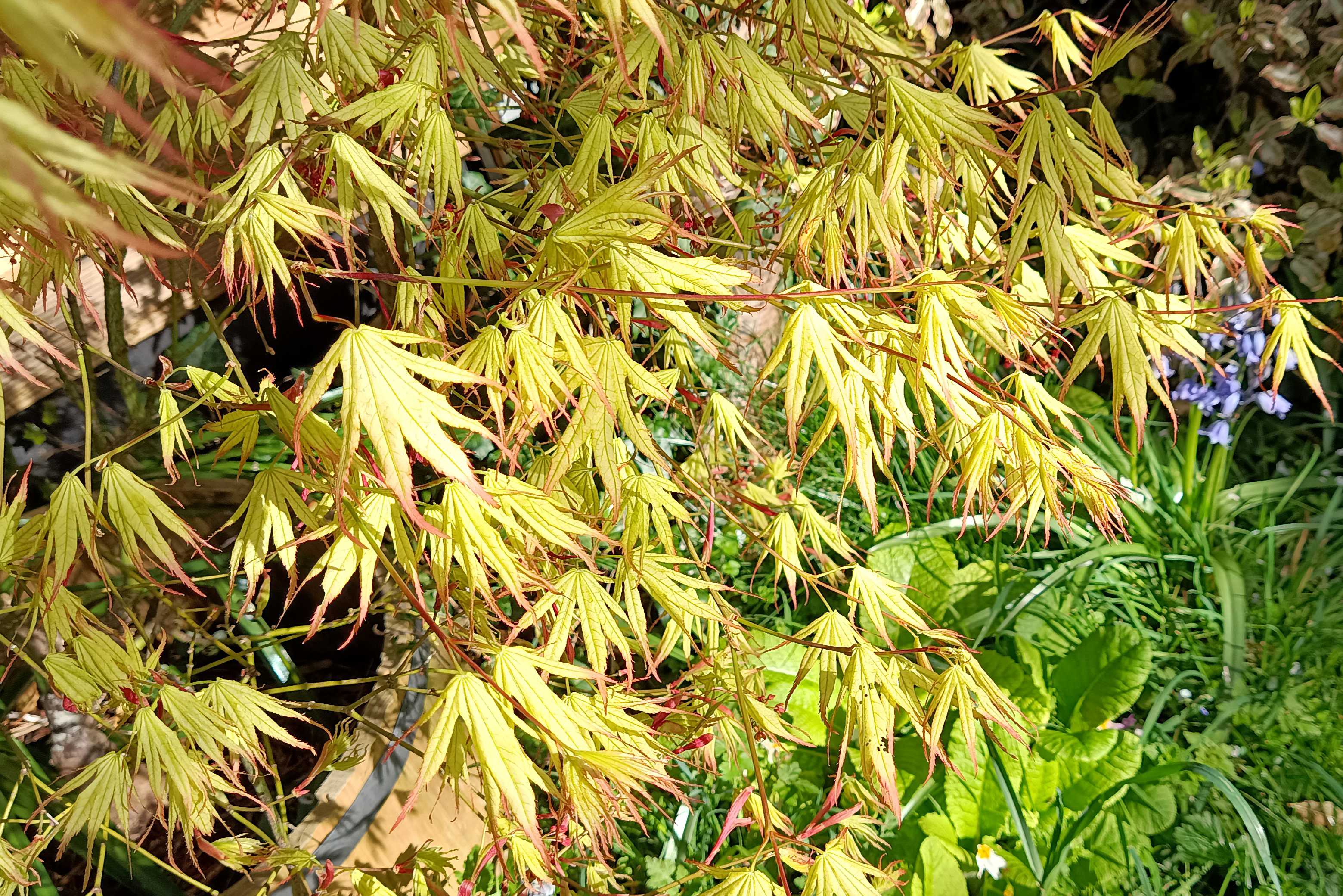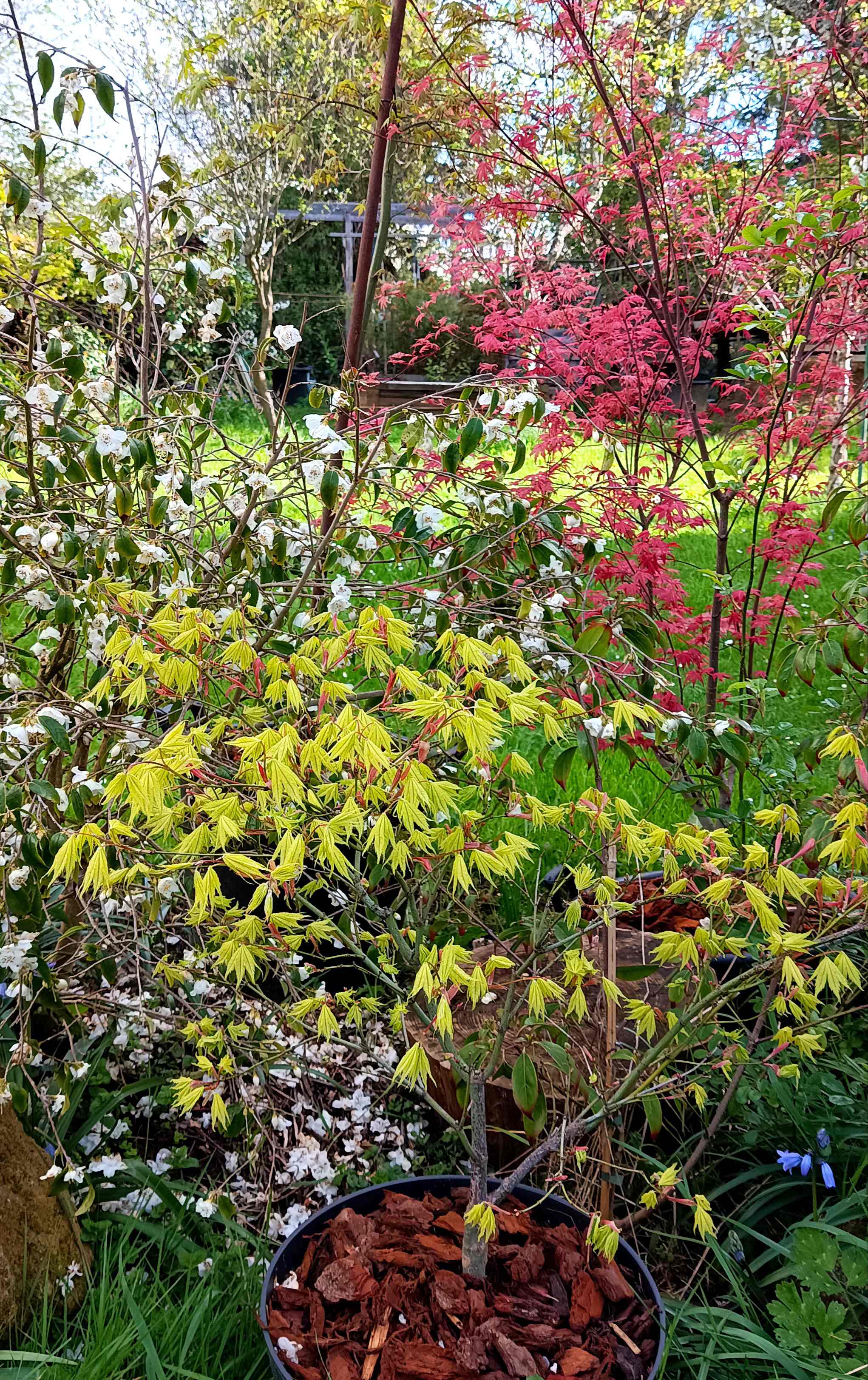 En ce deux avril et entre deux averses, un petit rayon de soleil dans la morne île de France. Quelles merveilles ces érables. Pour changer un peu des gros plans sur des feuilles, apprécions des associations de circonstance, ou quand les érables discutent avec des fleurs. J aime mon jardin, il change tous les jours et réchauffe le coeur.