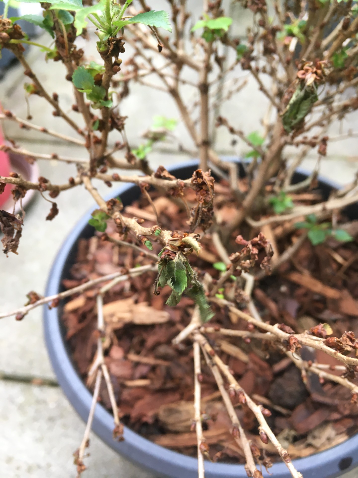 Il est arrivé ici en aout de l'année dernière, plein de feuilles, dans un pot de 3 litres avec pas tant de racines que ça. Le substrat retenait beaucoup l'eau, je l'ai rempoté cet automne dans un pot légèrement plus grand ( j'ai agrandi de 20cm à 26cm) en enlevant l'ancien le substrat et en mettant ce que je mets pour mes érables du japon ( terreau drainant, aéré..). J'ai mis les copeaux récemment avec les températures qui remontaient.