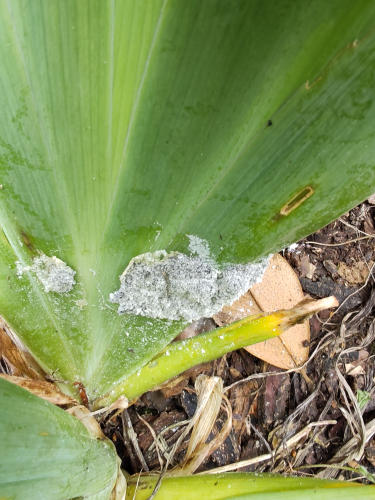 feuilles d'iris trouées et masse blanchâtre sur le pied
