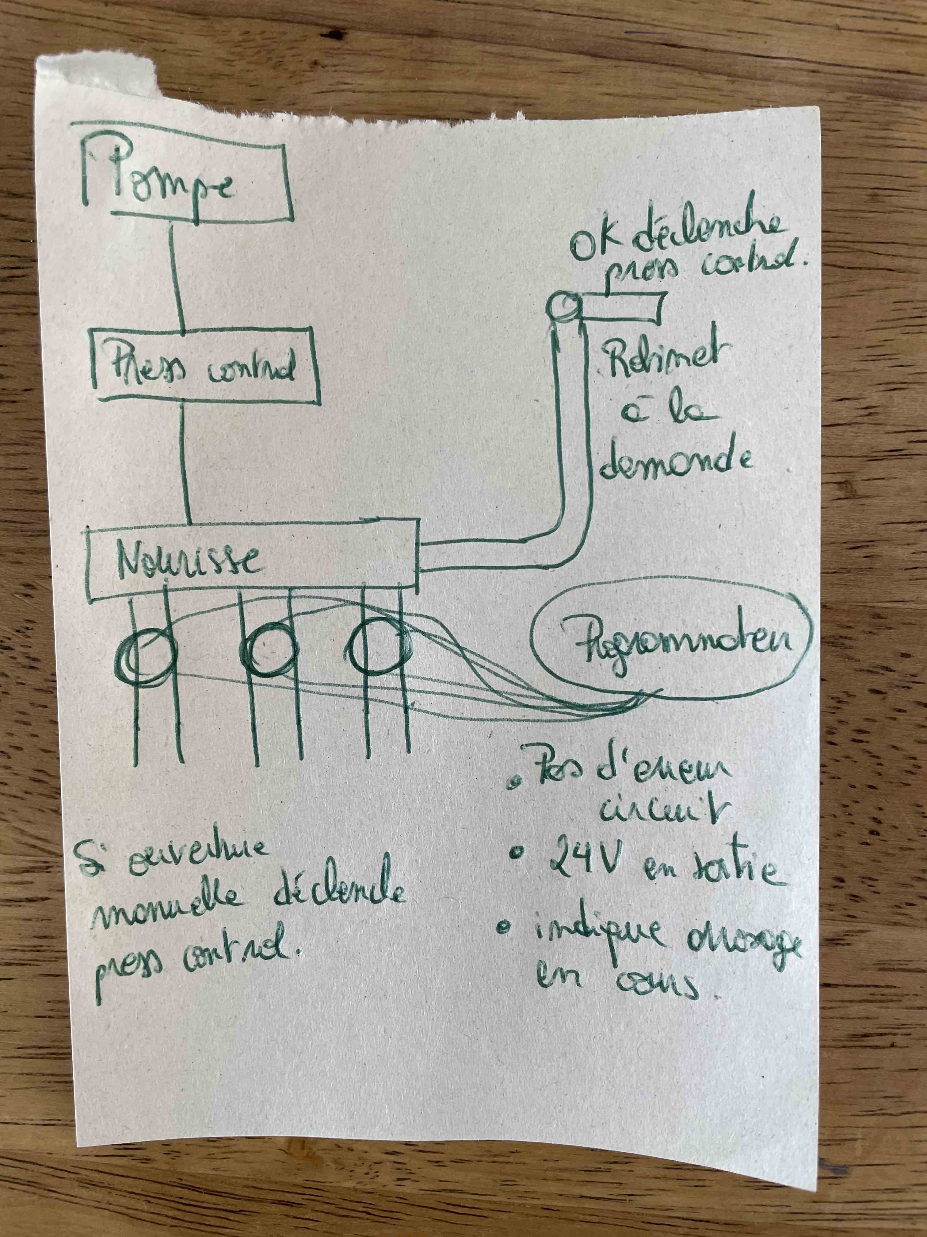 Nous avons un puis dans lequel nous avons mis une pompe immergée. Cette pompe est elle-même reliée et commandée par un press-control qui détecte si le circuit est fermé ou ouvert pour lancer/arrêter la pompe.