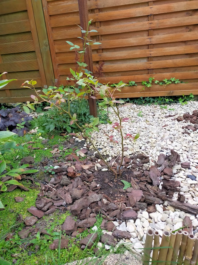 Les myrtilliers n'aiment pas le calcaire, or vous avez mis des cailloux blancs qui ne sont rien d'autre que du calcaire qui avec les pluies laissent des particules aller vers les plants.