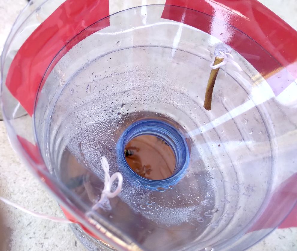 - j'ai confectionné un basique piège à guêpes/frelons avec de la bière, du miel et du vinaigre (Je n'ai pas de ruches autour de chez moi). Depuis hier, 3 ont été piégées (voir photo jointe).