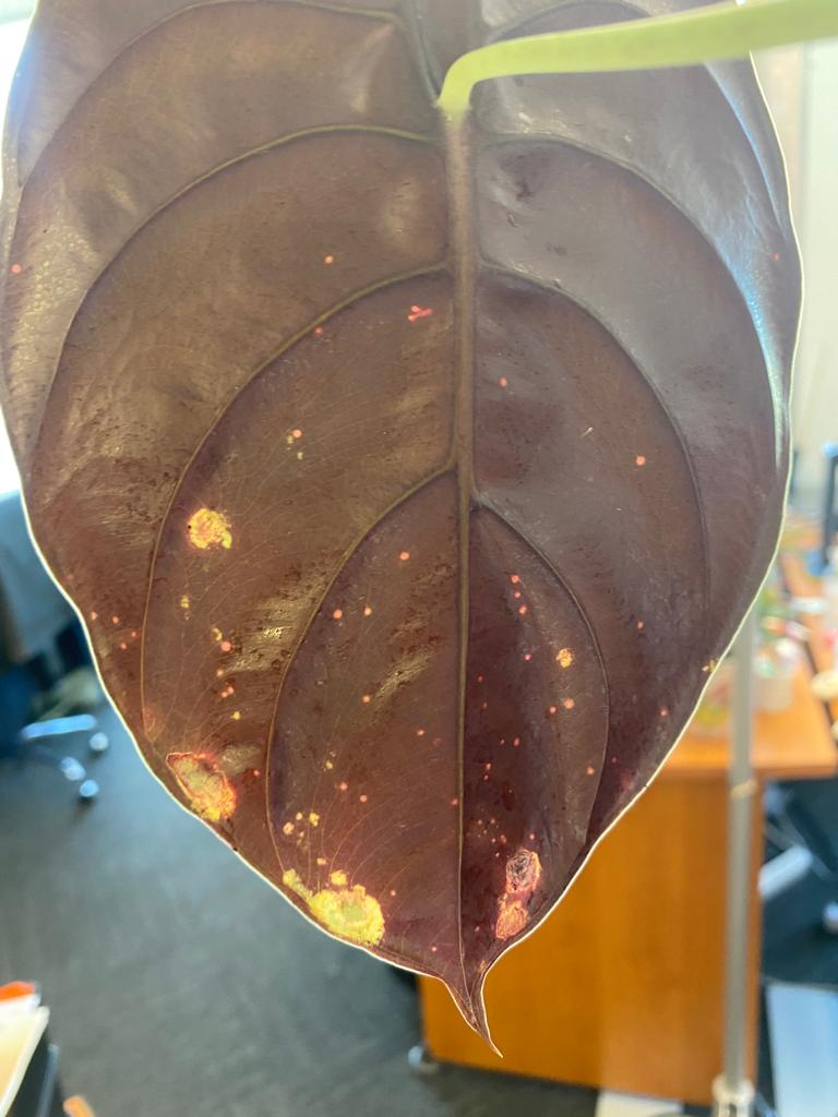 Bonsoir, depuis quelques jours j'ai remarqué que des sortes de petits points étaient apparus sur les feuilles de mon alocasia cuprea red secret. Ils sont surtout visibles par transparence lorsque je mets les feuilles face à la lumière. Mais surtout, certains de ces points se sont transformés en petites taches de couleur marron entourées de jaune sur le dessus de la feuille.