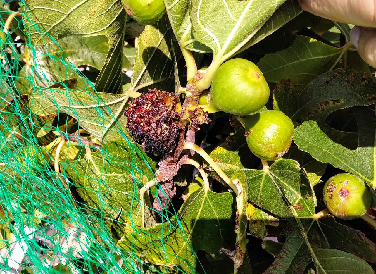 Bonjour, sur une terrasse dans 2 grands bacs, j'ai 2 figuiers. Ils sont actuellement très chargés en fruits en cours de maturité. Dès maturité des premiers fruits, les pigeons se sont jetés dessus. Un filet par dessus et hop, les pigeons sont allés voir ailleurs. MAIS hélas une autre espèce est venue s'y installer: les guêpes. Et là, c'est une autre paire de manche. Dès qu'une pièce commence à mûrir (noircir) , elles l'envahissent et la picorent: voir résultat sur photo jointe, elles sont non mangeables.