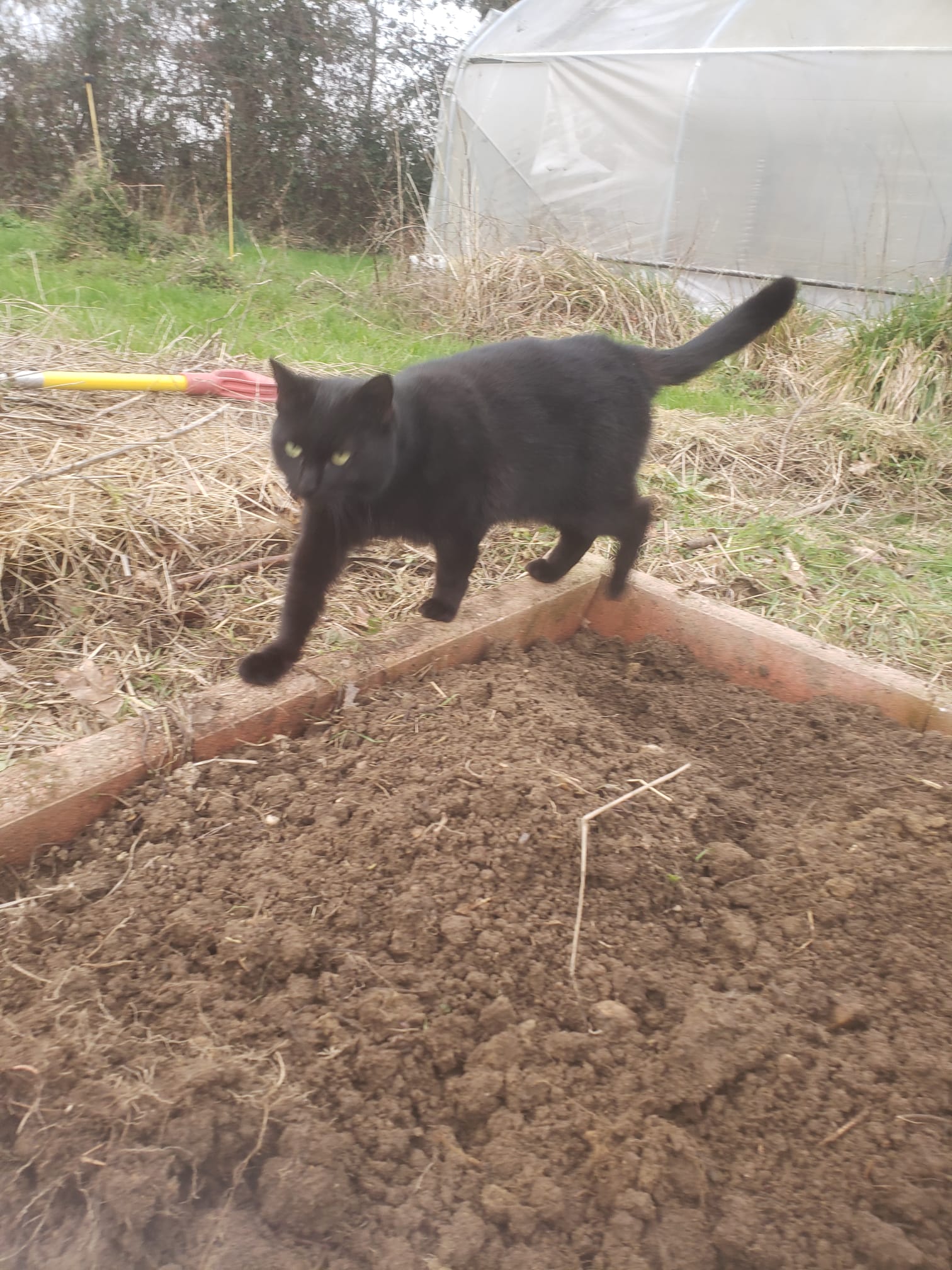 Futur emplacement des choux et salades Après désherbage et plantation Puis amendement de compost, couverture de foin et P17 Un des chou, après l'arrosage Future emplacement des fèves Fèves semées et mises sous tunnel type Modulo (à l'abri des grattages des chats) Un des chats, justement, qui vient régulièrement me tenir compagnie La vie dans le compost de l'année en cours Tentatives de naturalisation de jacinthes et cyclamens, "sauvés" de la benne au travail Le "avant - après" d'un désherbage du soir, pendant 40 minutes, en rentrant du travail 40cm² ---> il reste plus mètres carrés pour rendre le jardin tout juste "acceptable"