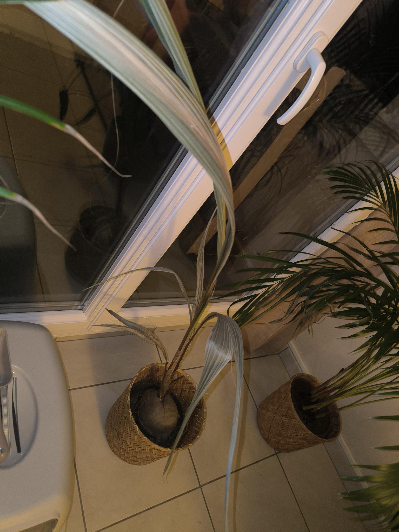 Bonjour, voici mon coco nucifera que j'ai reçu pour Noel do,c depuis peu. Les branches son devenues toutes sèches et la branche principales "qui ressort de la coco" s'enlève facilement dès que l'on tire légèrement dessus.