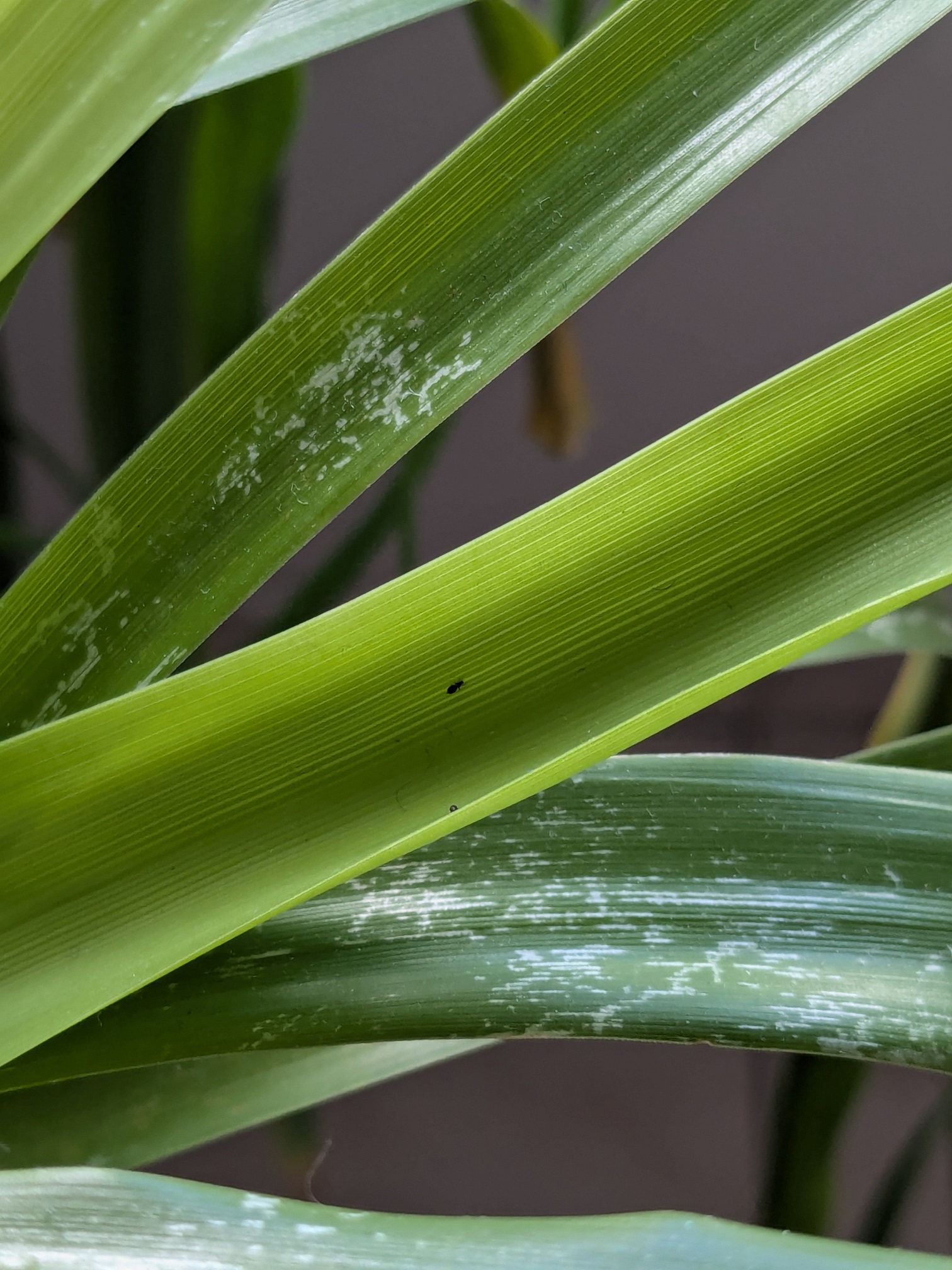 Je viens vous demander de l'aide pour identifier ce qui attaque mon Beaucarnea. J'ai découvert récemment qu'il était recouvert de petits insectes noirs, je l'ai donc douché plusieurs jours d'affilé puis changé tout le terreau.