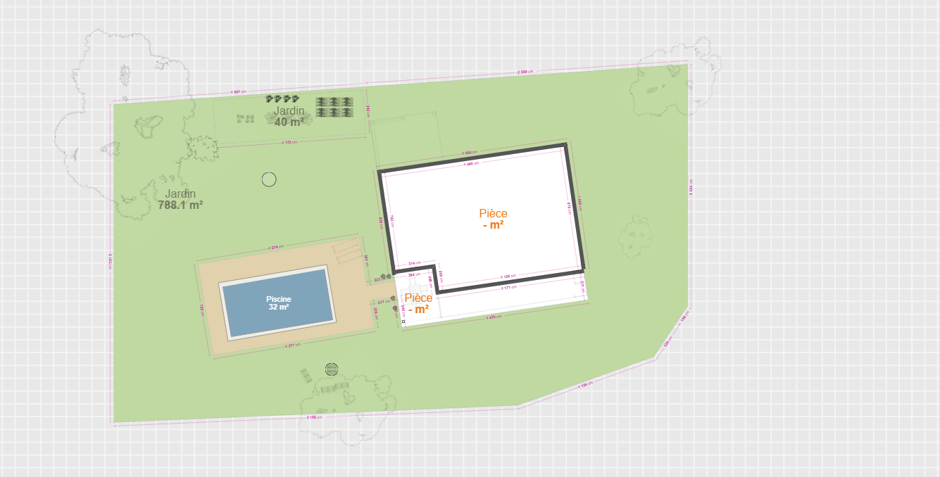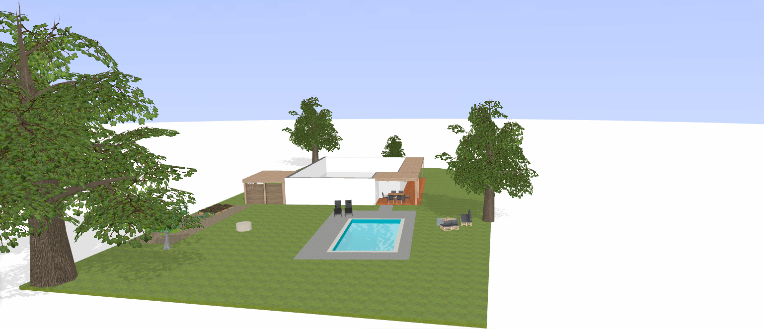 Je vous joins à mon post une vue satellite de la maison (avec une belle piscine bien verte !) ainsi qu'un plan 2D et un visuel 3D que j'ai réalisé avec kazaplan. Le Nord est en haut du plan. J'ai placé sur le plan les éléments existants : piscine, terrasse, arbres (ce sont des chênes sauf celui à droite de la maison dont je ne suis pas sure), la forme ronde au dessus de la piscine étant un puit (enfin un forage avec pompe non immergée mais de l'extérieur ça ressemble à un puit). J'ai également placé du mobilier là où j'envisage de le placer et une zone ou je souhaiterai réaliser un potager.