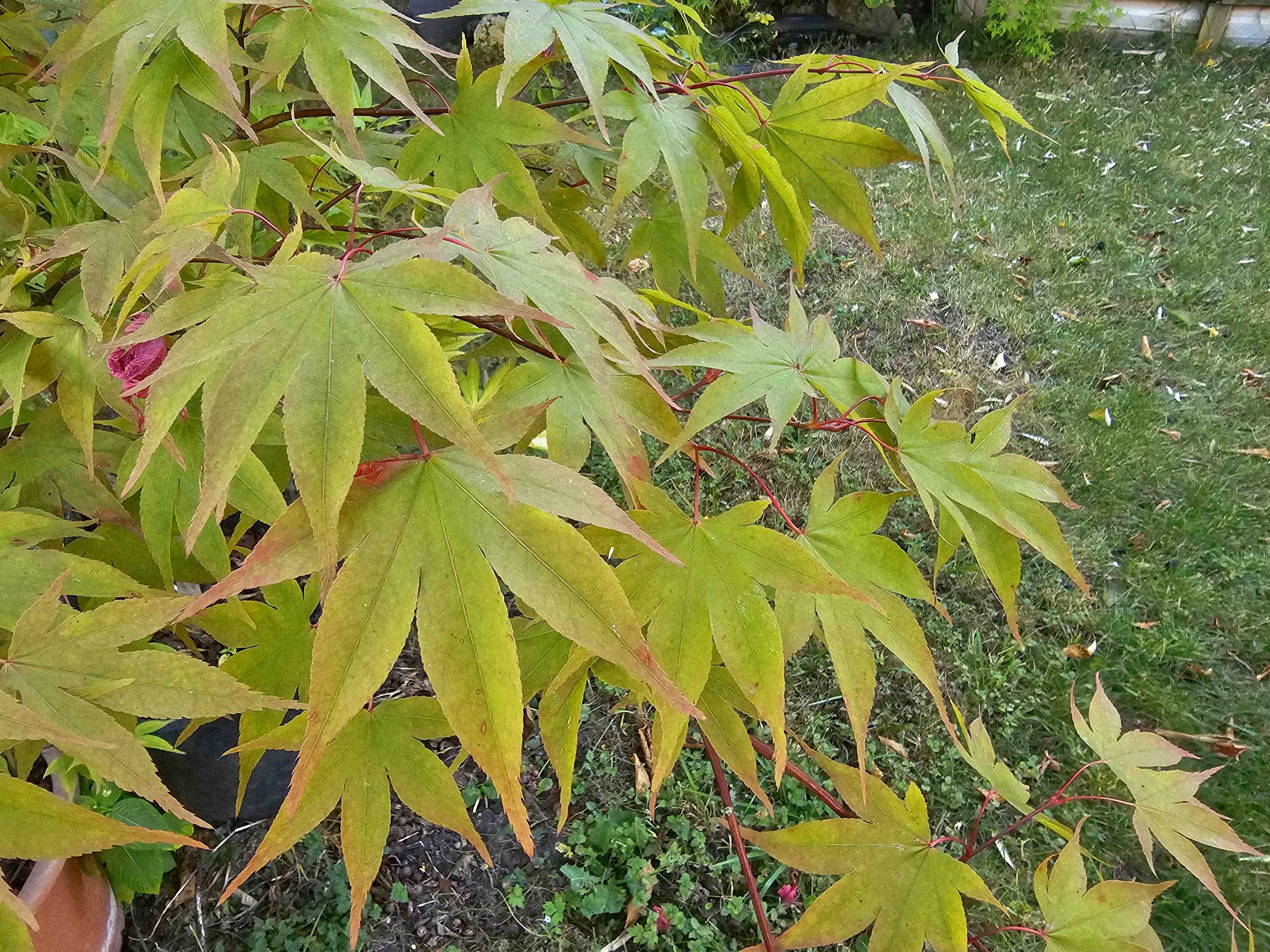 La chaleur a rendu a mon osakazuki akame sa couleur pêche de printemps, alors que mon autre osa lui va sur un vert profond. Les deux ont a peu près la meme expo, un peu de soleil direct dans l après-midi, photos de ce 24/6, île de france