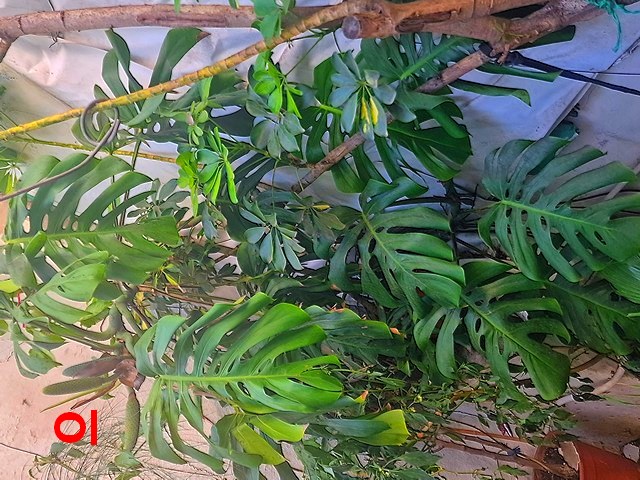 Ce monstera déliciosa ,ou faux philodendron,ou plante gruyère mesure 2m environ.Chaque deux ans,il me récompense avec deux ou trois fruits délicieux.