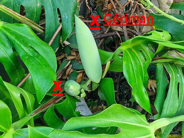Ce monstera deliciosa de deux ans prendra la relève avec ses deux fruits que je viens de débusquer sous le feuillage