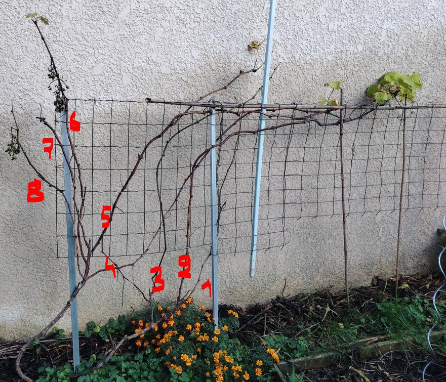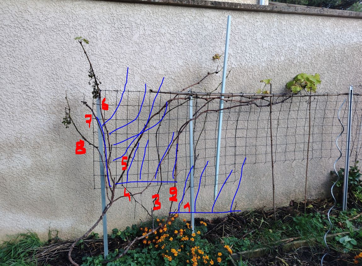 Je pensais garder les sarments 2, 5 et 6 (ou 7). et les aligner comme sur la photo en bleu pour occuper au mieux l'espace Certains conseillent de garder 3 à 4 bourgeons sur du muscat de hambourg, mais ca me semblait risqué, ou alors peu de bourgeons mais beaucoup de baguettes ?