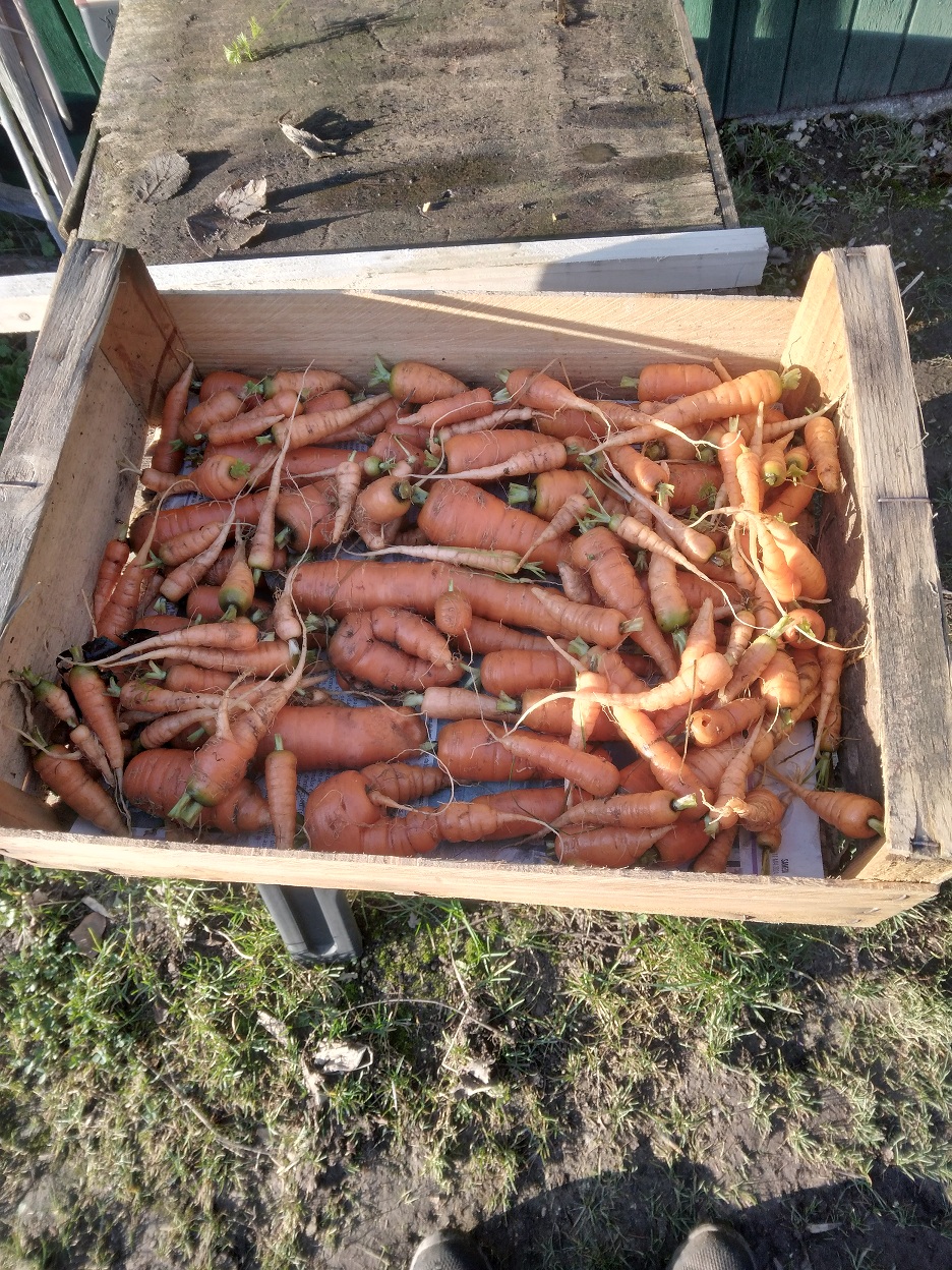Aujourd'hui j'ai récolté les carottes Colmar. 1,2 Kg. La prochaine fois ce sera le tour des carottes blanches.