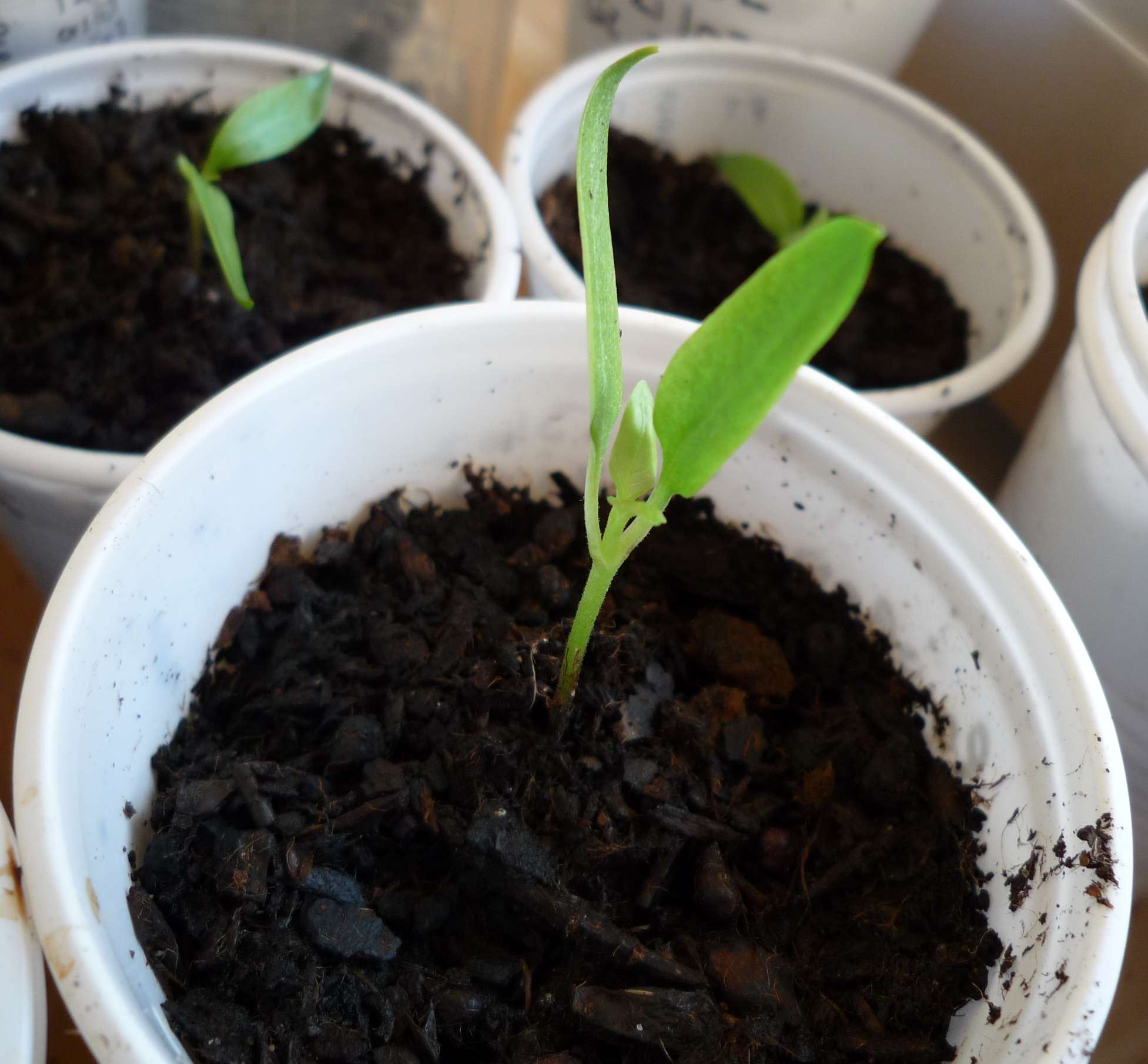 donc, 4 plants de poivrons font voir leurs premières vraies feuilles ! bon, elles mesurent 2-3 mm mais on les voit arriver !!!!!!!!! trop trop trop trop bien...