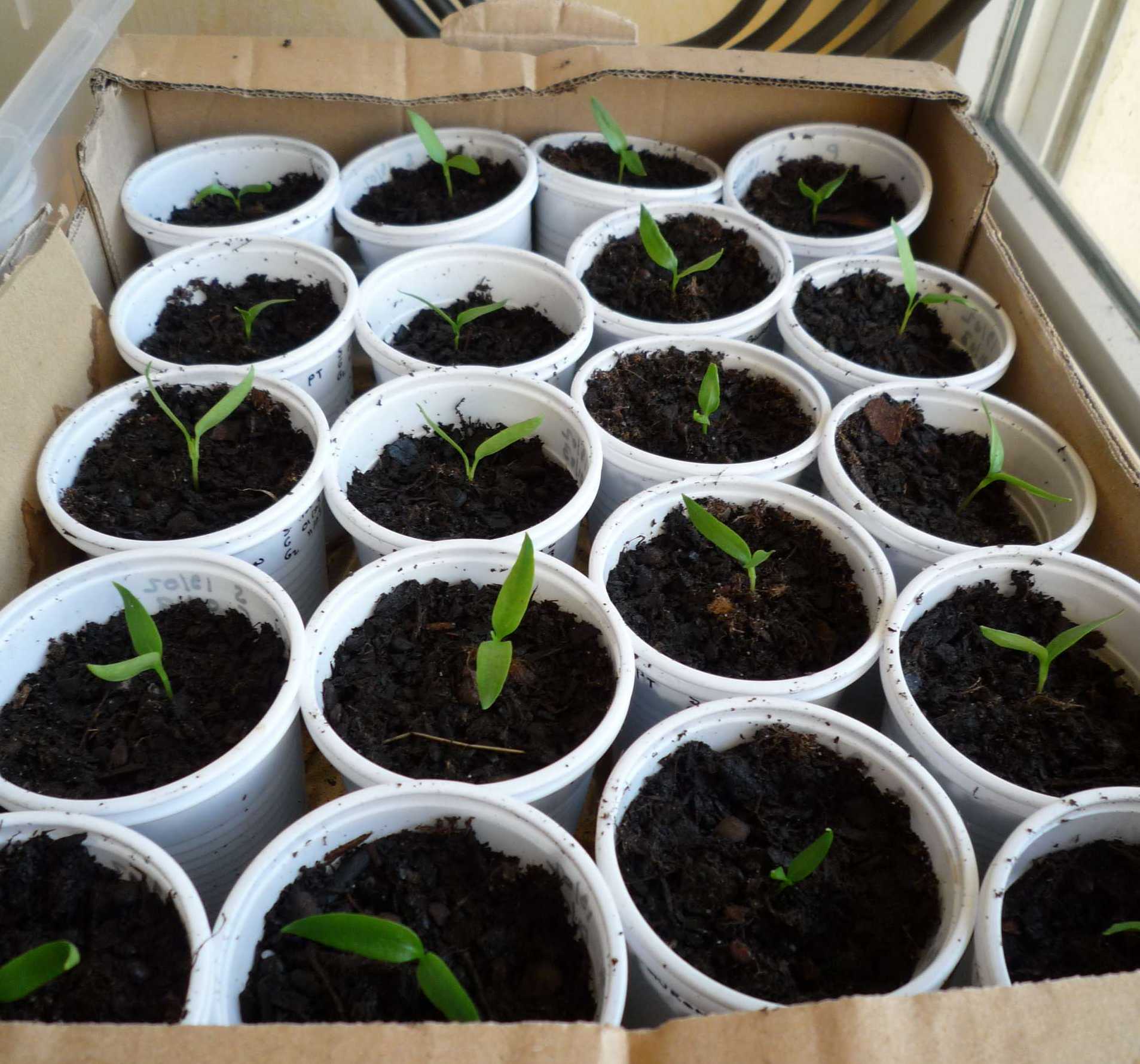 poivrons et piments poussent... il faudrait que je vérifie, j'ai l'impressoin qu'ils deviennent un peu jaune... c'est pas très normal n'est ce pas ? mais, c'est peut etre qu'une impression, sachant que j'ai pas vu avec la lumière naturelle...