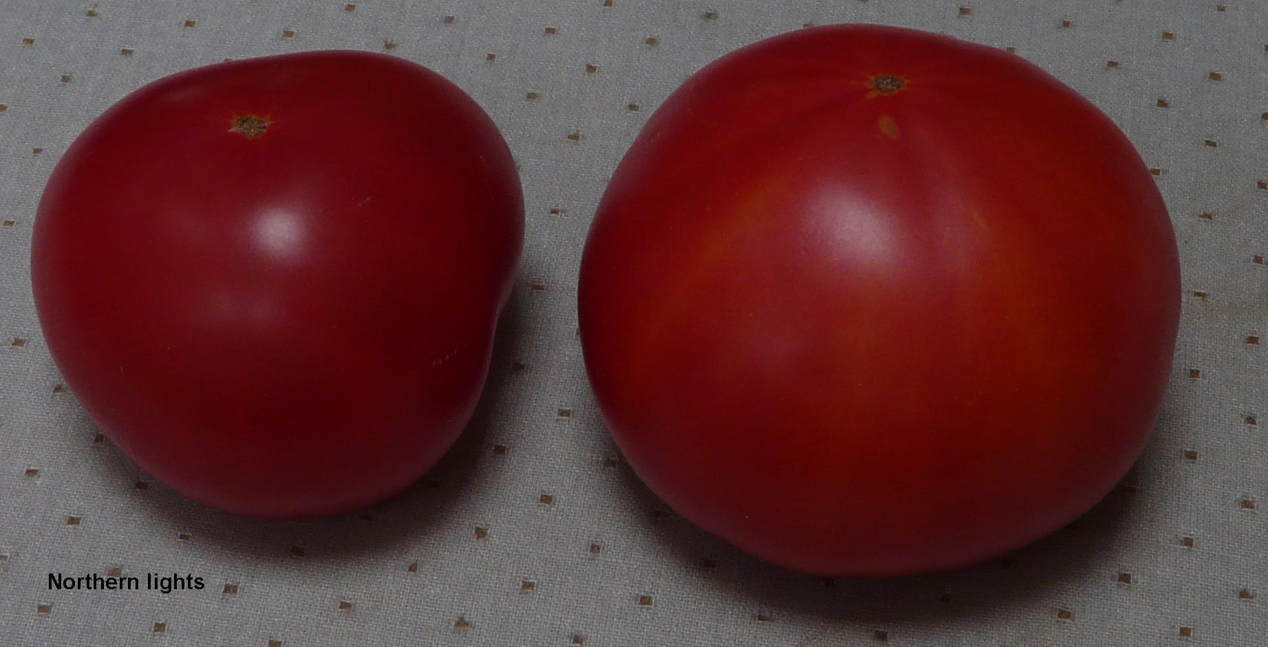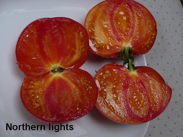 Je précise que ces tomates sont issues de graines de chez Solana, car en consultant la liste des fournisseurs de graines canado / américains, à la vue des photos qui sont insérées dans les catalogues je soupçonne qu'il y a plus d'une variété (ou mutation) vendue sous le même nom Northern lights.