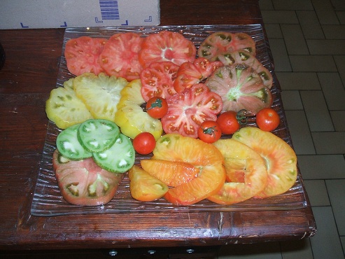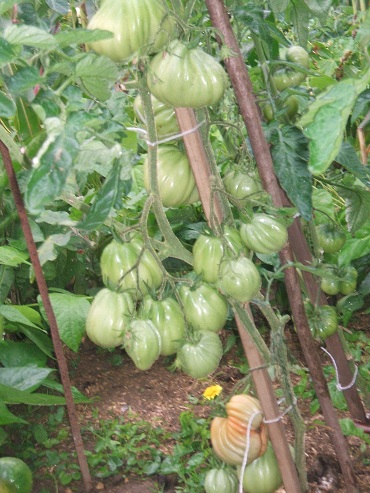 Ensuite la jaune en forme de coeur est une Cleota Yellow, j'aurai quelques spécimens énormes dans cette variété. Au dessous c'est une lemon boy. Ensuite avec celle qui est en coupe des "Northerm light" (oranger) du type ananas mais que je trouve beaucoup plus précoce , productive et très bonne aussi. Elle peut passer du jaune oranger au rouge.