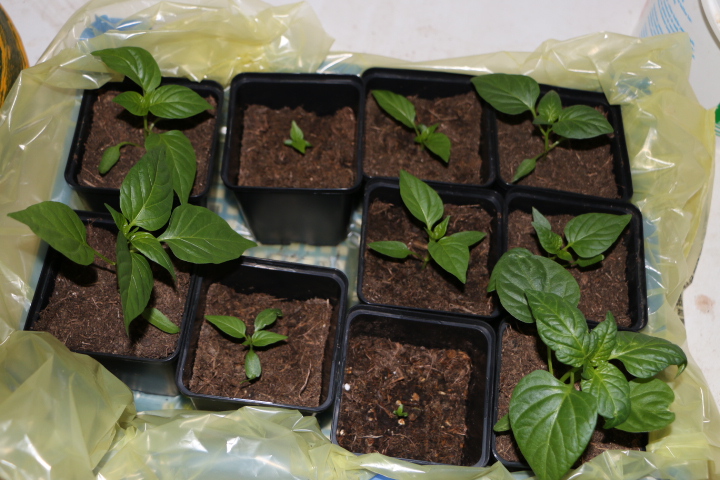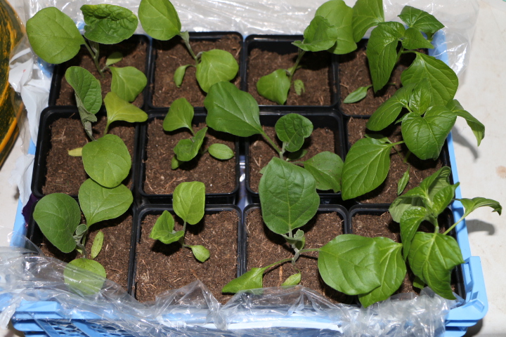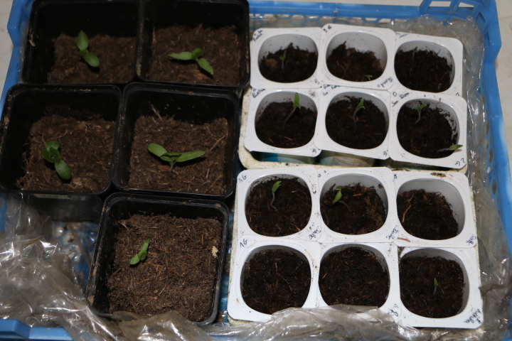 On voit bien la différence entre les premières germées (Barbentane et Halflange) par rapport aux dernières (Dourga et Rontonda bianca sfumata di rosa), d'autant que, comme chez les poivrons et piments, certaines ont eu de grosses difficulté à sortir les cotylédons, qui se sont cassés en ne laissant que des moignons. A terme, cela ne gênera pas leur croissance (déjà vu les années précédentes).