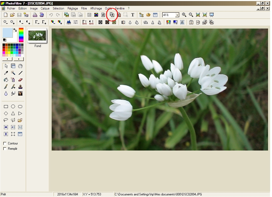 Sur PhotoFiltre, indiqué par le cercle rouge, la touche pour réduire le poids de ton image à 600ko quelque soit le rapport H/L: