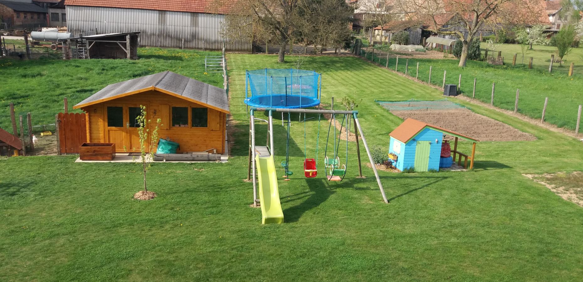 à droite le potager traditionnel à gauche le potager en carré La serre sera au soleil mais cachée de la terrasse par l'abri de jardin.