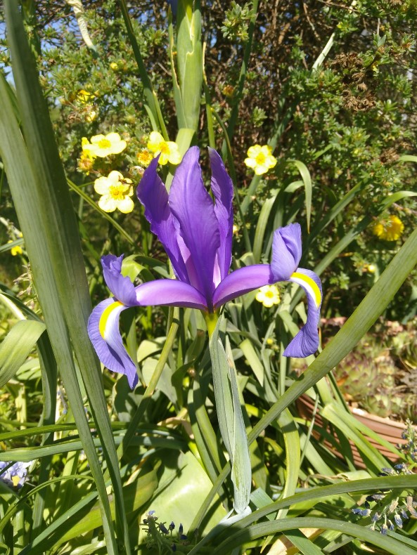 Les iris, au moins, ça n'a pas d'épines, et celui-ci est né d'une graine. La fleur est beaucoup plus grosse que les iris bleus communs que j'ai par ailleurs, et la couleur n'est pas exactement la même, plus soutenue, plus profonde. Peut-être un croisement avec le study in black ci-dessous ou un autre iris bleu nuit dont j'ai oublié le nom et que je vous montrerai quand il aura cessé de pleuvoir.