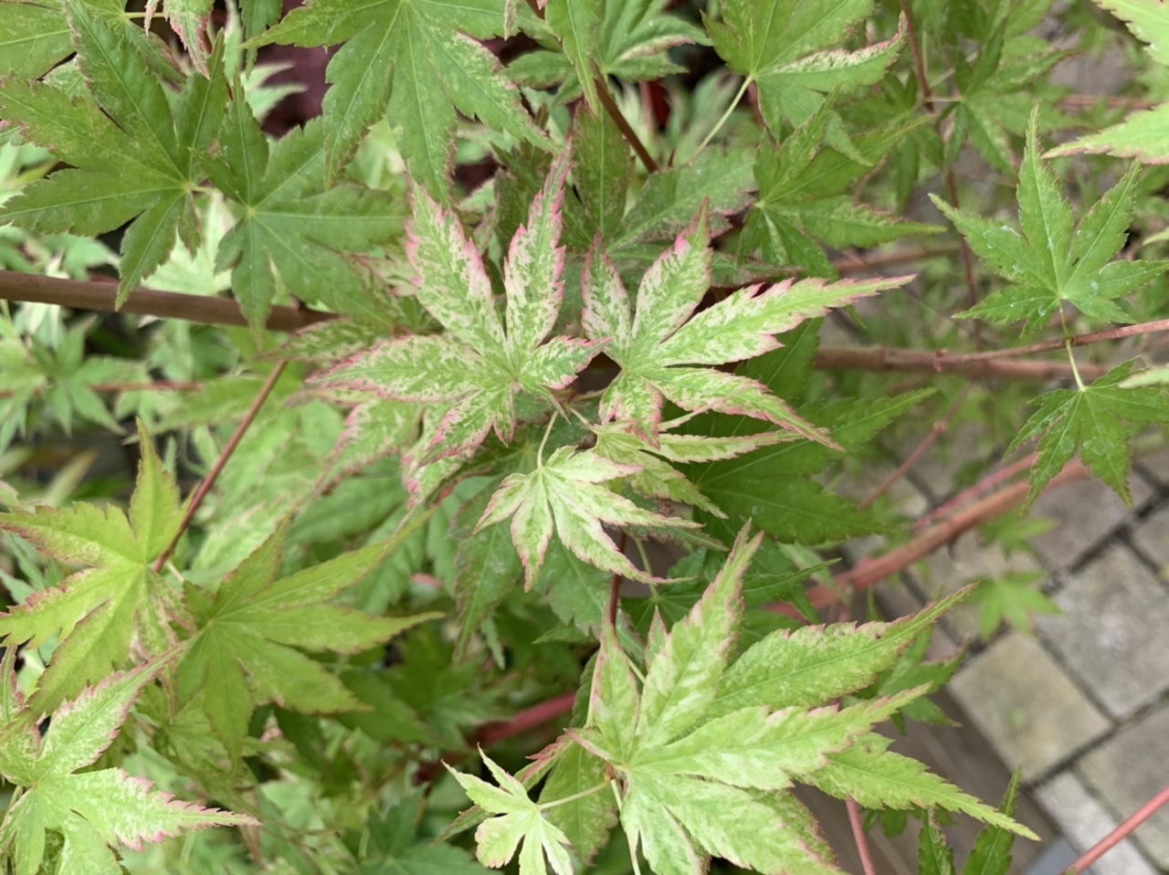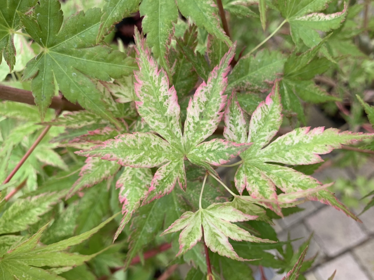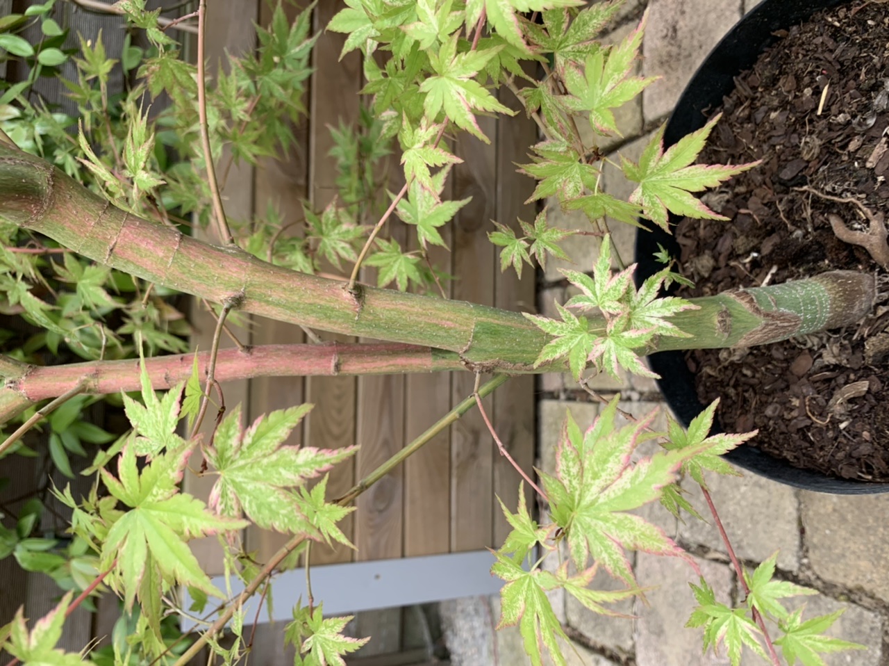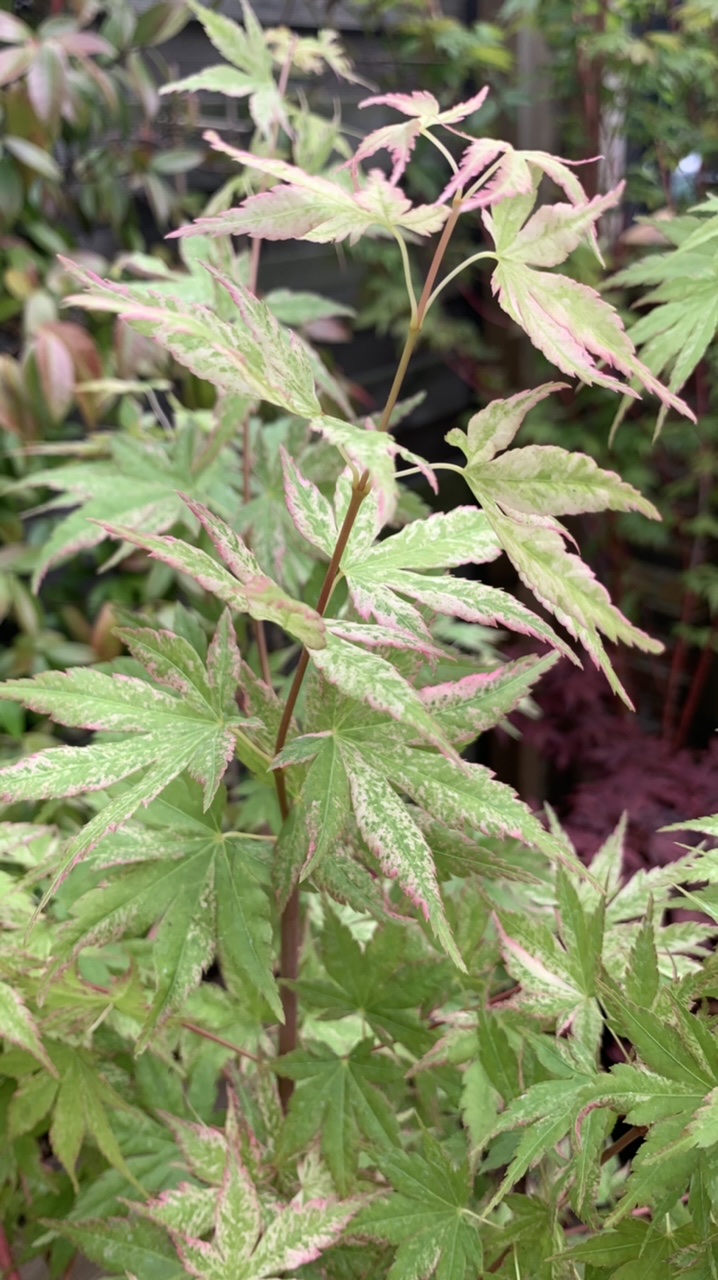 Mon 'chuetsu nishiki' n'a pas autant de panachures que le tien et très peu de rose : il faudra attendre plus de soleil et les pousses de la deuxième partie de saison pour se faire une idée des possibilités de ce cultivar. Il faut garder à l'esprit que tous les spécimens d'un même cultivar ne présentent pas la même quantité de panachures, il est possible que le mien soit un peu faible à ce niveau, d'autant que le tronc est à peine coloré de rose. Nous verrons bien au printemps prochain, car les conditions de culture ont une importance cruciale pour les couleurs. Le vert des feuilles est particulier, plus pâle que celui des Acer au vert prononcé, type 'aoyagi', 'shidava gold' ou même 'kawahara no midori'. J'aime beaucoup ! La plante à un port érigé très agréable, une taille déjà conséquente, le sommet du houppier était complètement replié dans le carton. La plante était très bien emballée, solidement attachée dans le carton, bravo à Maillot, je sais que c'est souvent lui qui s'y colle.