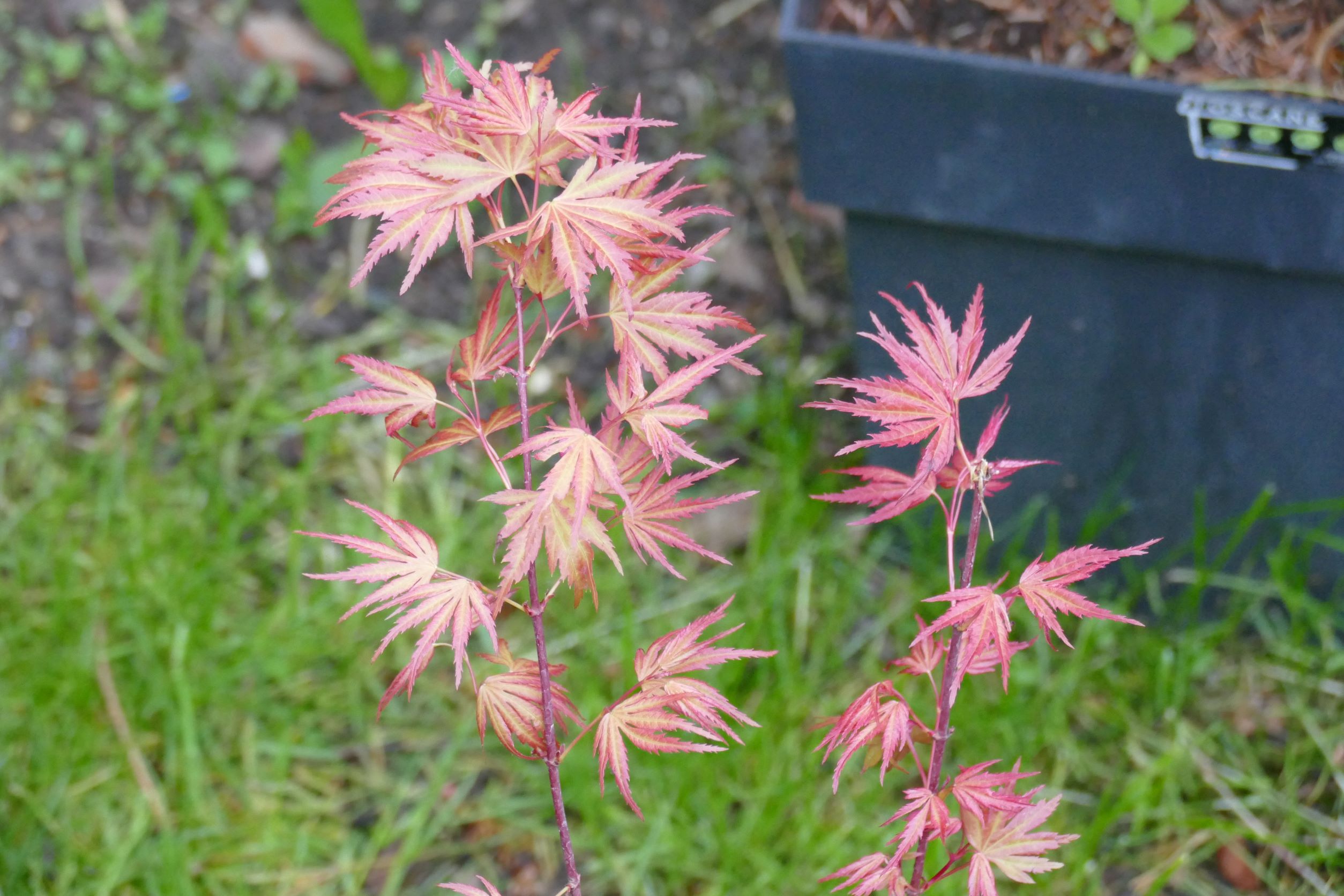 La seconde photo est celle de 'baton rouge', lui aussi a une belle taille, je suis agréablement surpris, le tronc est presque aussi costaud que celui du specimen reçu d'Esveld. En revanche la couleur est décevante, les feuilles sont déjà complètement vertes alors qu'elles devraient avoir des tons rougeâtres très marqués, c'est la particularité de 'baton rouge' par rapport à 'sango kaku' au moment du débourrement. La plante que j'ai reçu à débourré bien plus tôt, c'est tout (différence de climat). Les feuilles sont bien plus grandes que celles de 'Sango kaku', une autre particularité de 'baton rouge'.