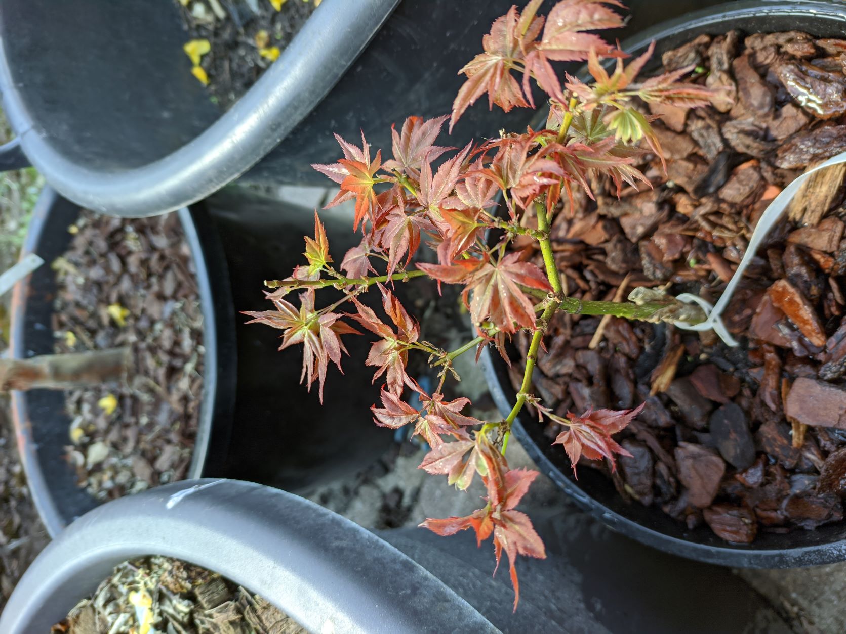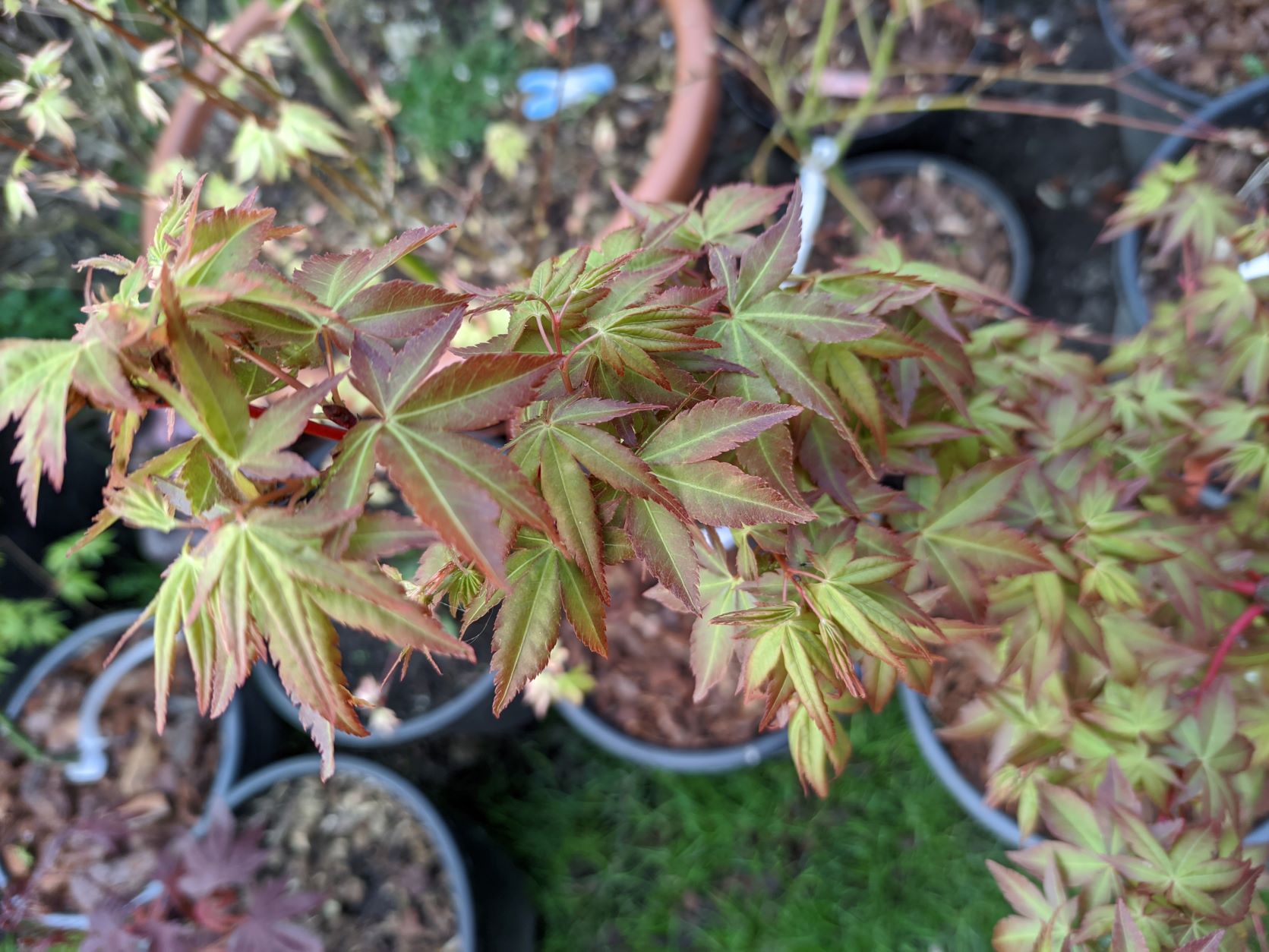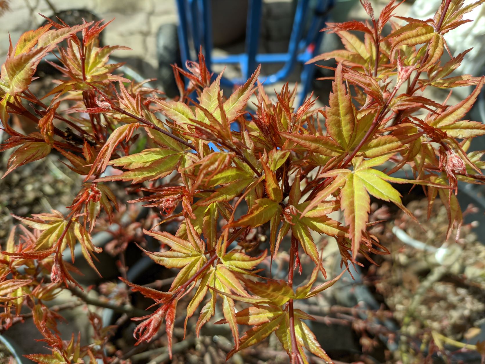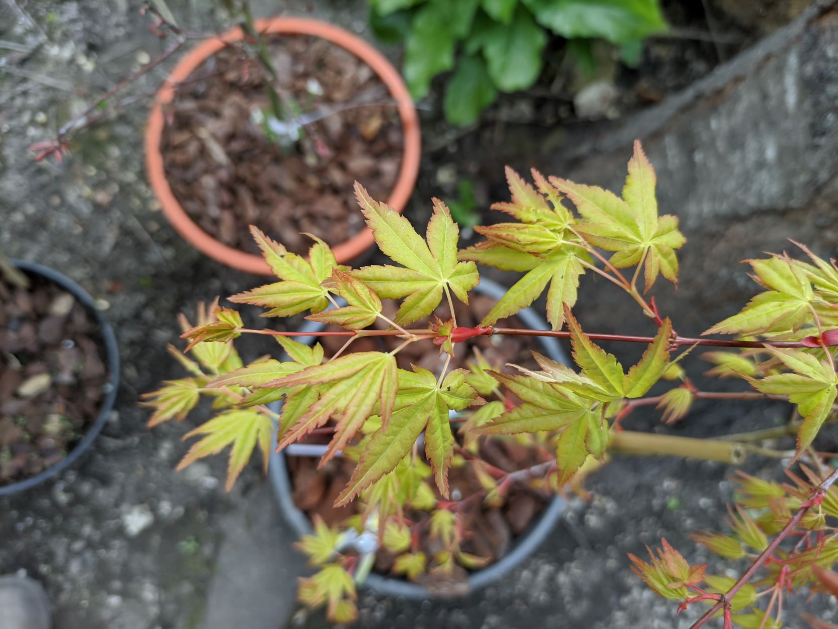 'fujinami nishiki' est capricieux, les panachures apparaissent ou disparaissent de façon aléatoire d'une année sur l'autre, voire définitivement après quelques temps selon plusieurs témoignages : il est difficile de savoir à quelles conditions de culture il répond le mieux... Les années à venir me le diront, du moins je l'espère. Cette année, je constate qu'une branche, la même que l'année dernière, ne présente pas de panachures, juste cet aspect bicolore que tu vois sur la photo. De l'autre côté, en revanche, les feuilles qui commencent à s'ouvrir laissent entrevoir les fameuses panachures. Je devrais, comme l'indique Maillot d'où provient ce cultivar, supprimer la branche non panachée pour offrir un maximum de vigueur à celles qui le sont, mais je vais attendre un peu et voir comment les choses évoluent. Il sera mis en terre sans doute à l'automne et nous verrons bien, mais déjà je sais que les panachés réagissent souvent à la taille racinaire et aérienne, c'est une réaction hormonale, les couleurs en sont la manifestation, je ne rentre pas dans le détail, je sais que la communauté n'aime pas cela. Je ne souscrit pas du tout à ce type de traitement, tous mes Acer sont destinés à l'arboretum.