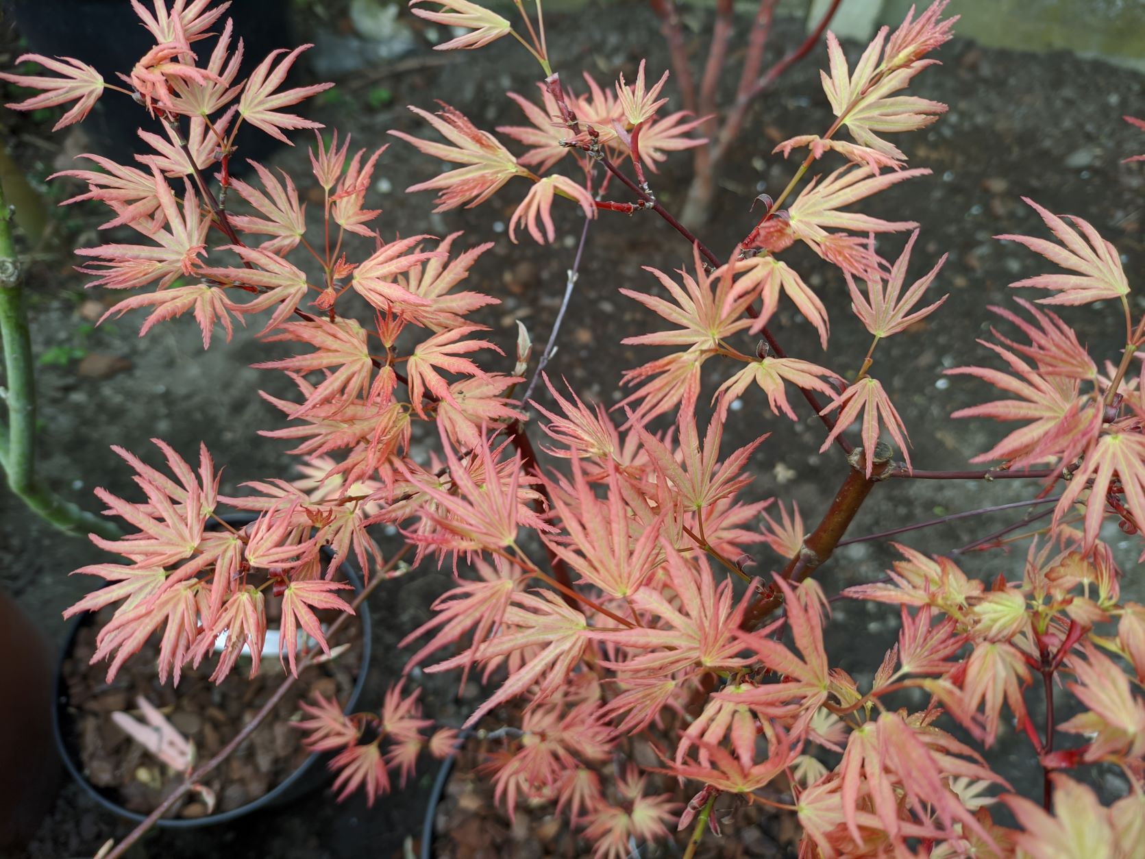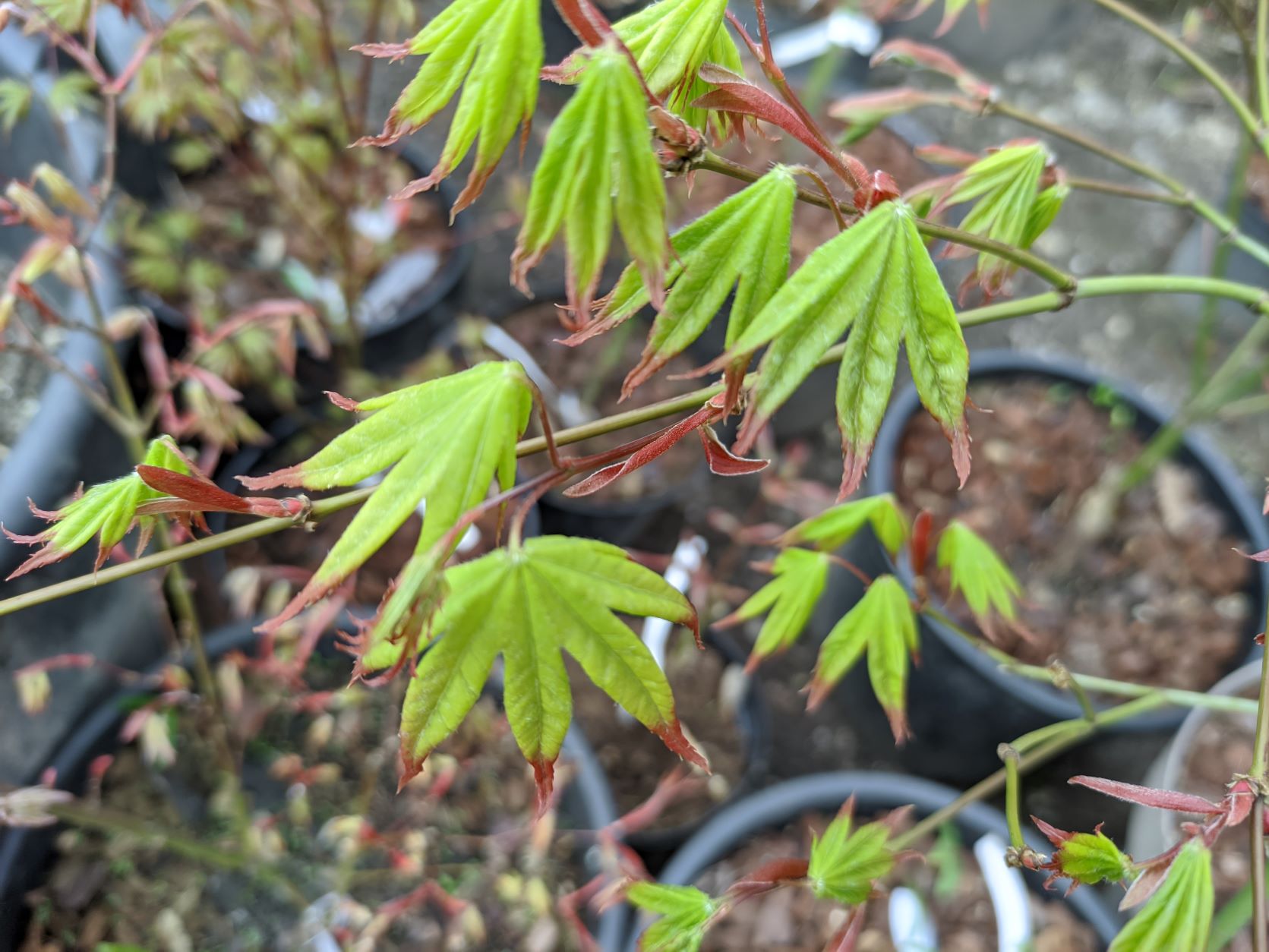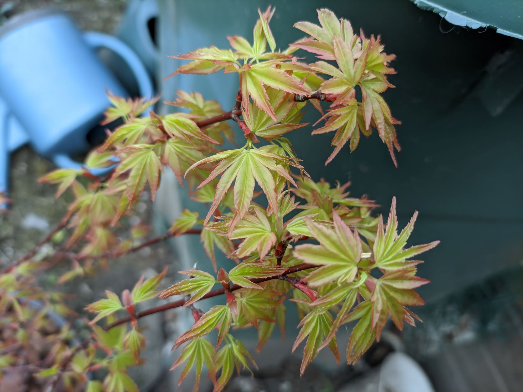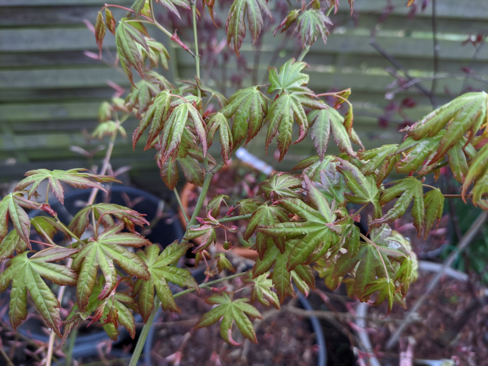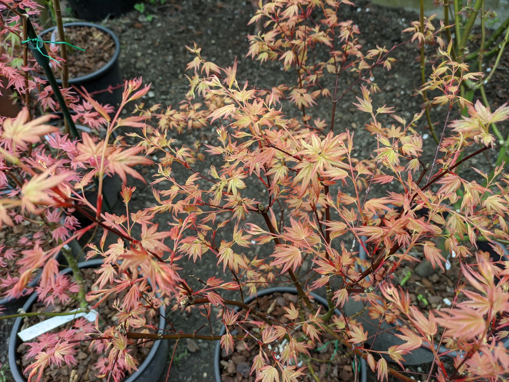 'fujinami nishiki' est capricieux, les panachures apparaissent ou disparaissent de façon aléatoire d'une année sur l'autre, voire définitivement après quelques temps selon plusieurs témoignages : il est difficile de savoir à quelles conditions de culture il répond le mieux... Les années à venir me le diront, du moins je l'espère. Cette année, je constate qu'une branche, la même que l'année dernière, ne présente pas de panachures, juste cet aspect bicolore que tu vois sur la photo. De l'autre côté, en revanche, les feuilles qui commencent à s'ouvrir laissent entrevoir les fameuses panachures. Je devrais, comme l'indique Maillot d'où provient ce cultivar, supprimer la branche non panachée pour offrir un maximum de vigueur à celles qui le sont, mais je vais attendre un peu et voir comment les choses évoluent. Il sera mis en terre sans doute à l'automne et nous verrons bien, mais déjà je sais que les panachés réagissent souvent à la taille racinaire et aérienne, c'est une réaction hormonale, les couleurs en sont la manifestation, je ne rentre pas dans le détail, je sais que la communauté n'aime pas cela. Je ne souscrit pas du tout à ce type de traitement, tous mes Acer sont destinés à l'arboretum.