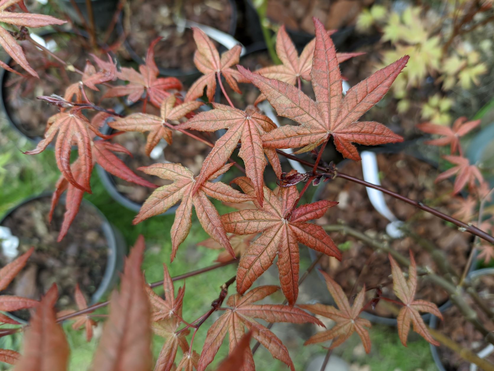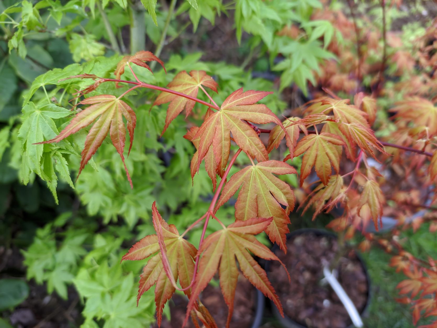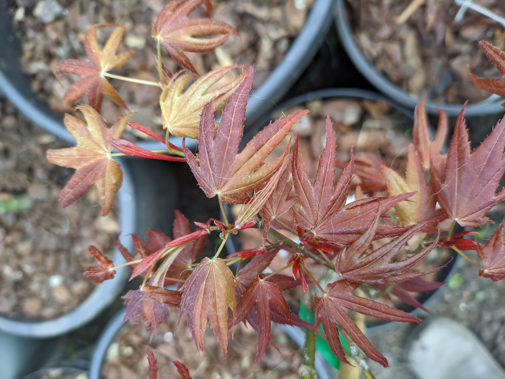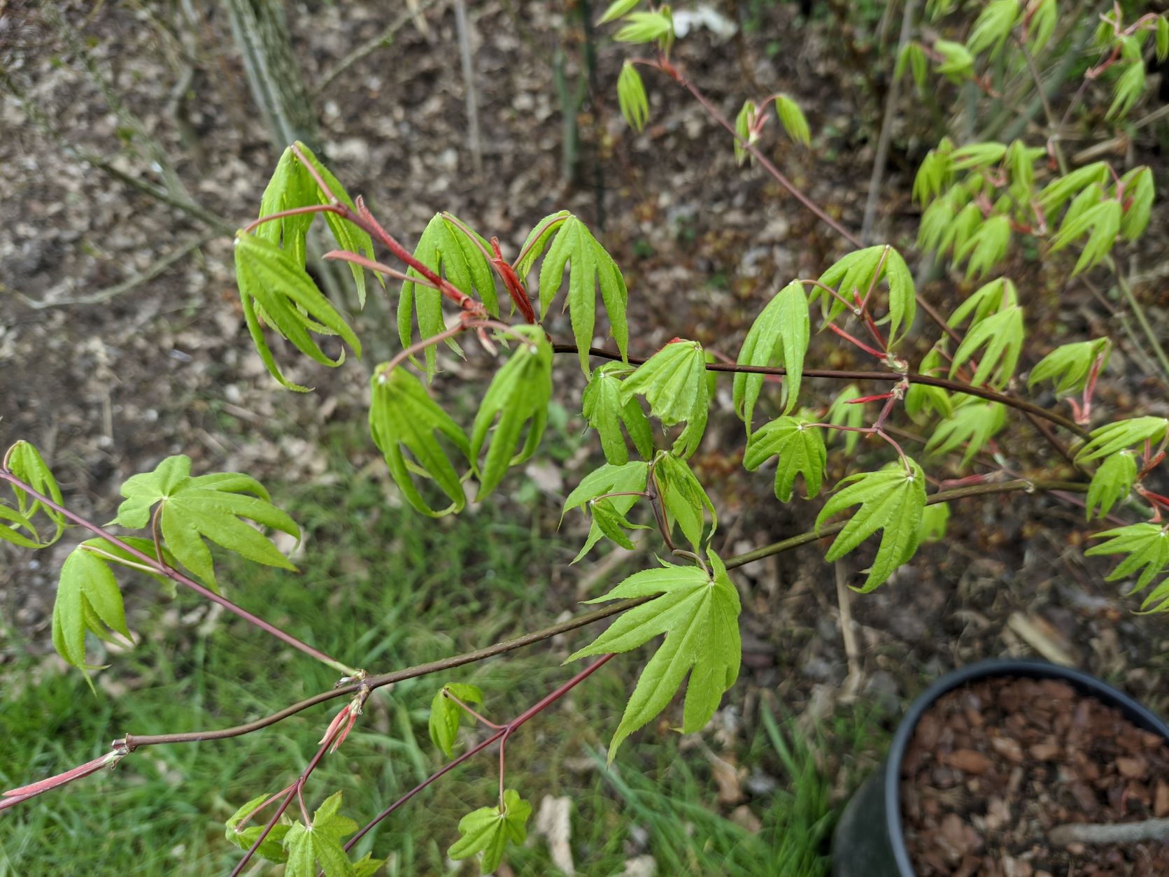 'fujinami nishiki' est capricieux, les panachures apparaissent ou disparaissent de façon aléatoire d'une année sur l'autre, voire définitivement après quelques temps selon plusieurs témoignages : il est difficile de savoir à quelles conditions de culture il répond le mieux... Les années à venir me le diront, du moins je l'espère. Cette année, je constate qu'une branche, la même que l'année dernière, ne présente pas de panachures, juste cet aspect bicolore que tu vois sur la photo. De l'autre côté, en revanche, les feuilles qui commencent à s'ouvrir laissent entrevoir les fameuses panachures. Je devrais, comme l'indique Maillot d'où provient ce cultivar, supprimer la branche non panachée pour offrir un maximum de vigueur à celles qui le sont, mais je vais attendre un peu et voir comment les choses évoluent. Il sera mis en terre sans doute à l'automne et nous verrons bien, mais déjà je sais que les panachés réagissent souvent à la taille racinaire et aérienne, c'est une réaction hormonale, les couleurs en sont la manifestation, je ne rentre pas dans le détail, je sais que la communauté n'aime pas cela. Je ne souscrit pas du tout à ce type de traitement, tous mes Acer sont destinés à l'arboretum.