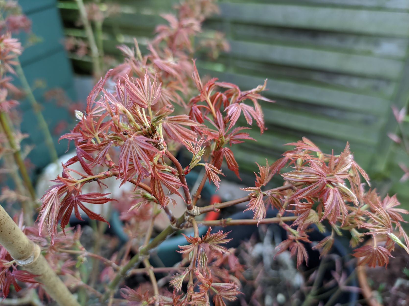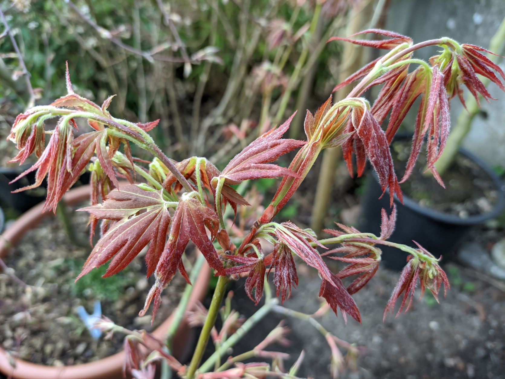 Skeeter et Sando sont les seuls à avoir leur feuilles complètement déployées mais ils sont sur la terrasse sous l'auvent de l'avancée de toit plein sud et à l'abri du Mistral. Ils sont avec les "bébés" érablesà moins de geler très fort sous la terrasse contre le mur de la maison. Mon mimosa en pot y a passé tout l'hiver, quelques feuilles ont grillé la nuit la plus froide (-10°)