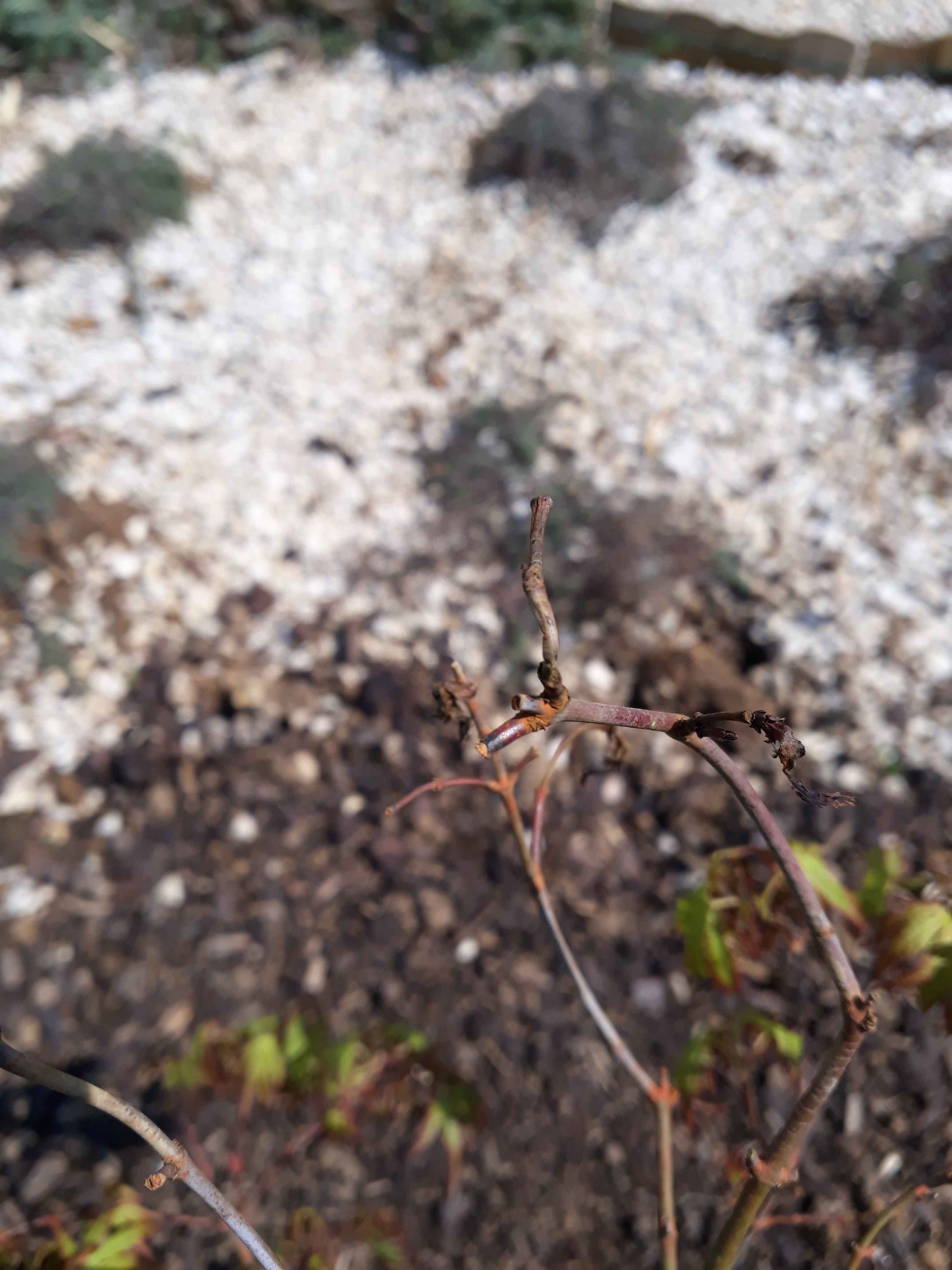 Ce qui m'inquiète davantage, c'est que des bouts de branches ont séchés, quasiment aucun bourgeons à l'horizon. Certaines branches principales sont un peu striées de gris, j'imagine que c'est aussi la morsure du gel (sur la photo 2 on peut le voir).