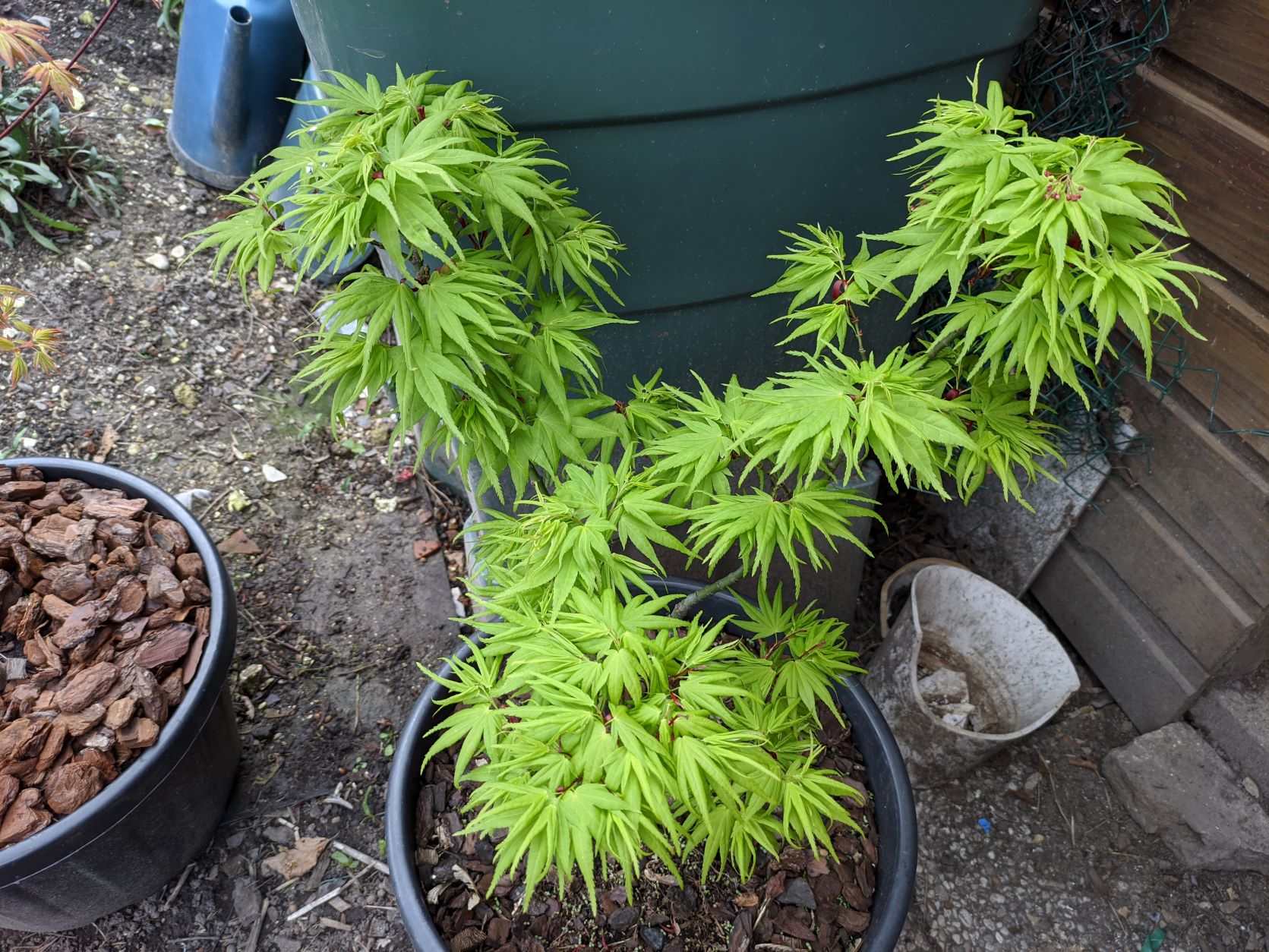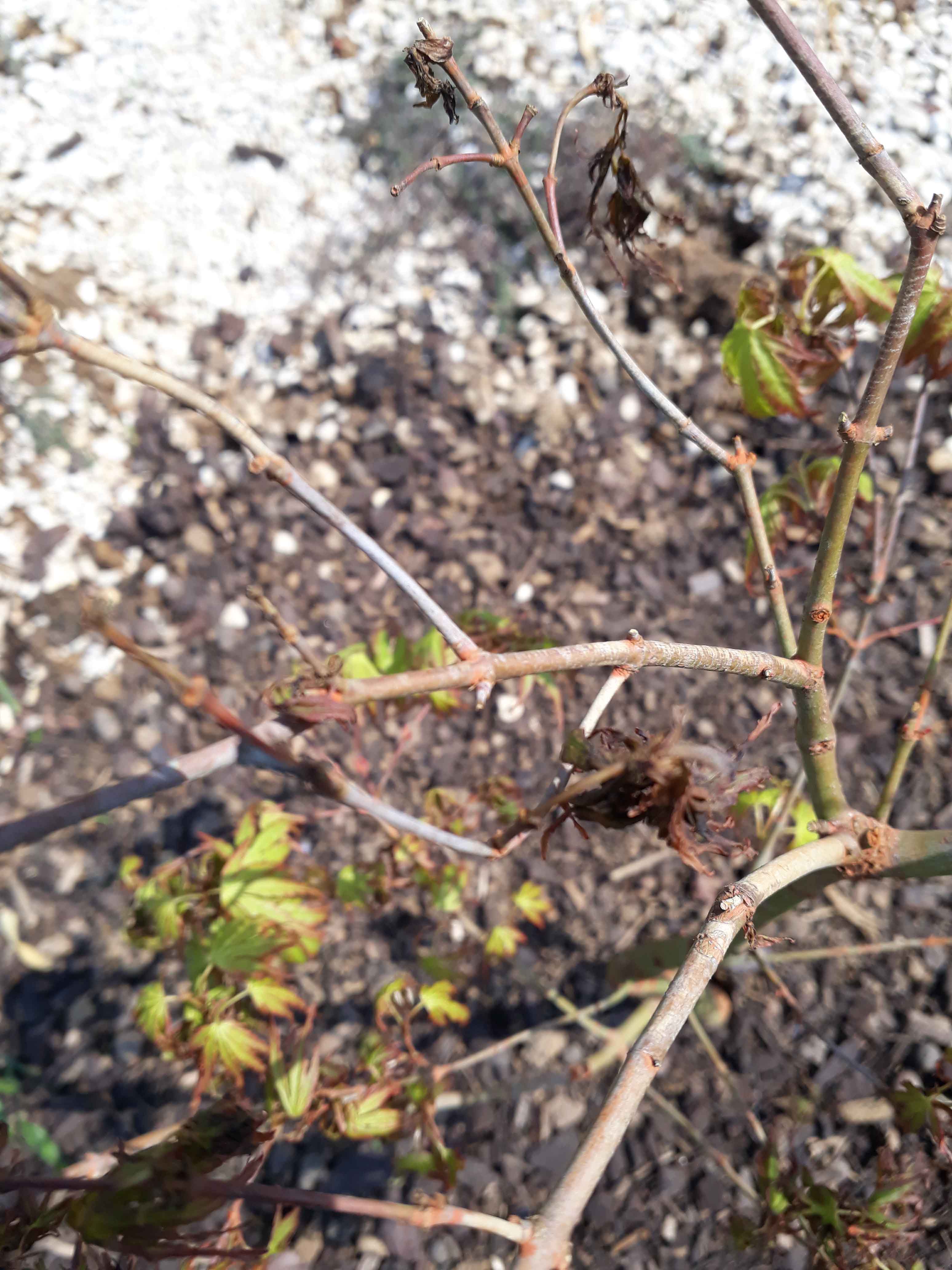 Suite à ce gel tardif, c'est lui qui a le plus souffert. Feuilles cramées bien entendu, j’avais mis un voile d'hivernage mais il y avait beaucoup de vent et il a découvert l'érable en grande partie. Il y a encore quelques feuilles peu endommagées en bas mais assez peu.
