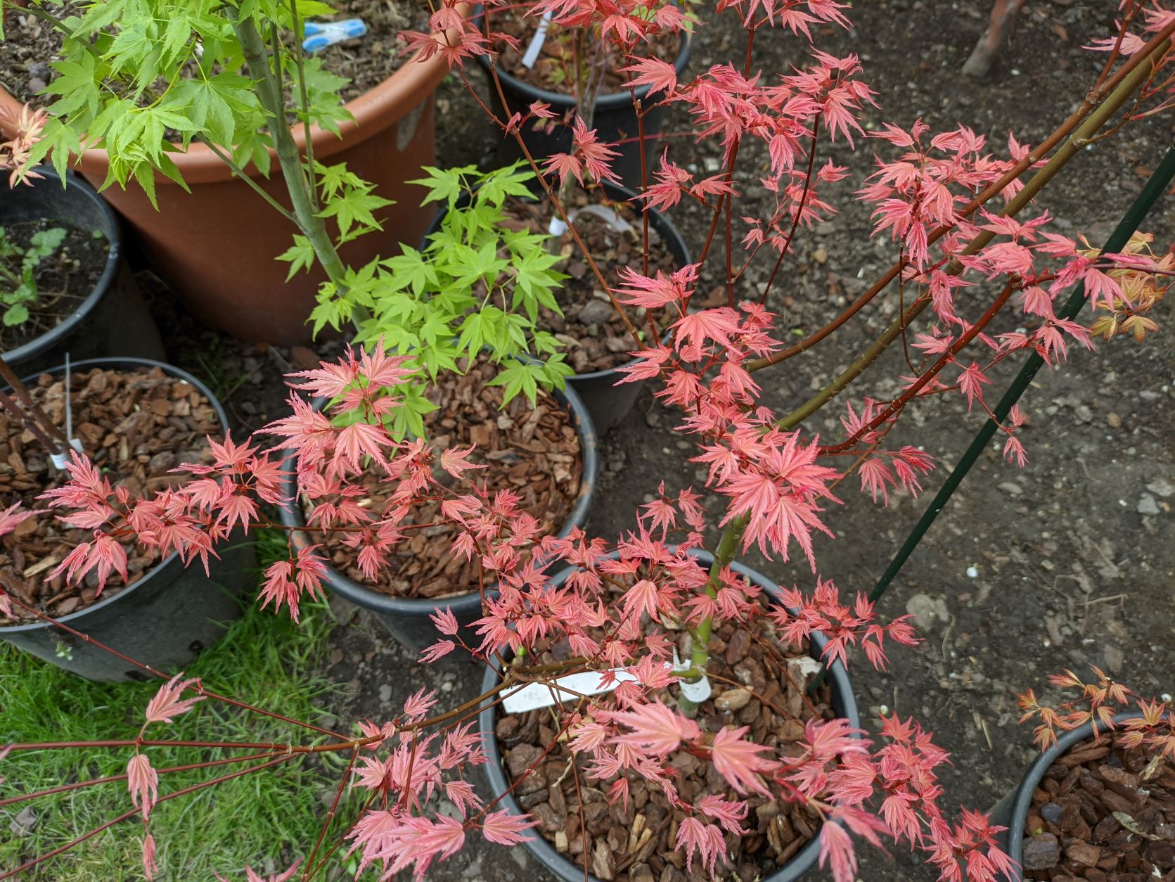 de gauche à droite : Shirasawanum aureum (très peu avancé), Murasaki Kiyohime (acheté il y a peu et arrivé avec ses feuilles), Metamorphosa, Béni Mayko (qui ont quasi stoppé leur débourrement)