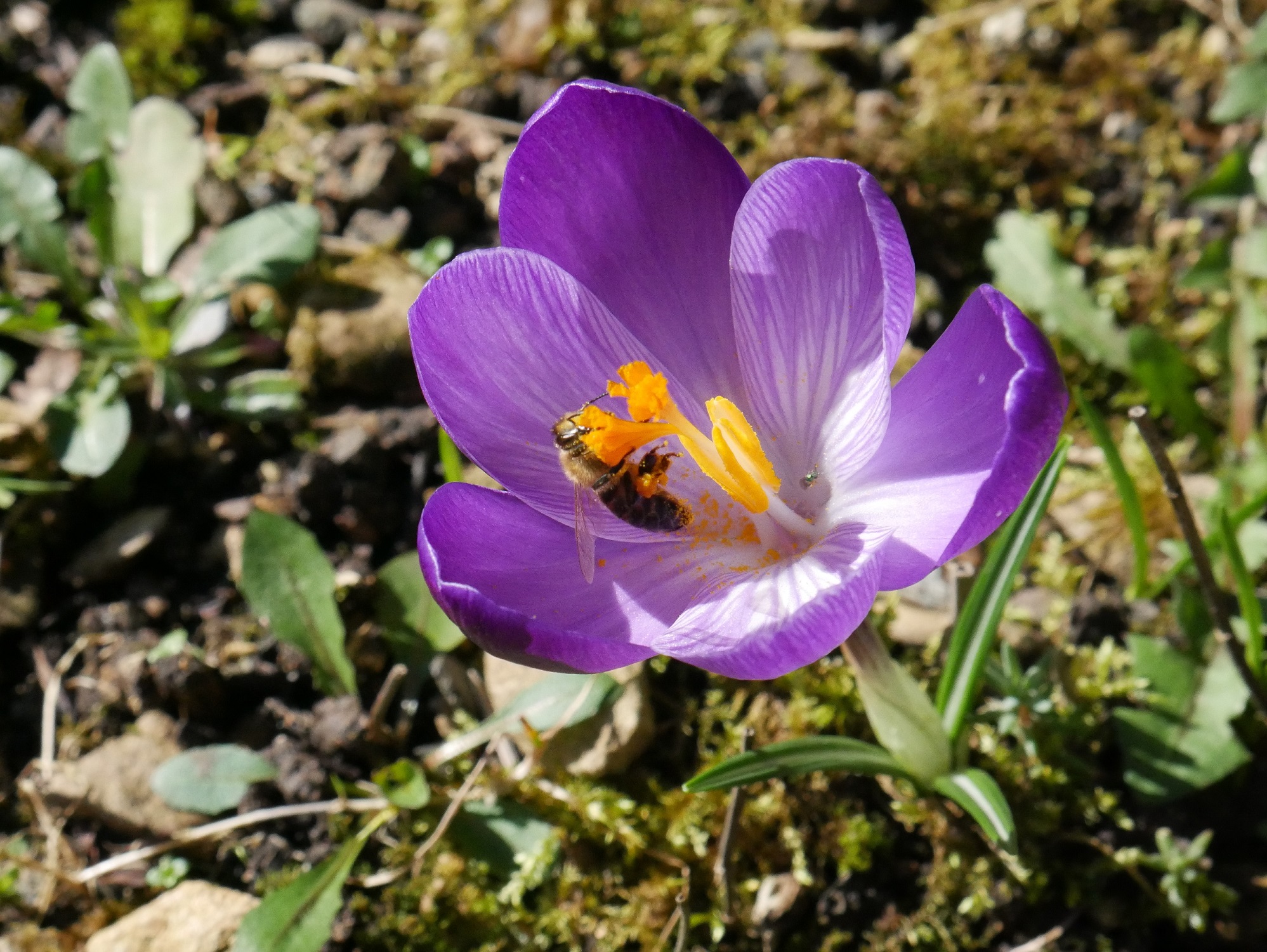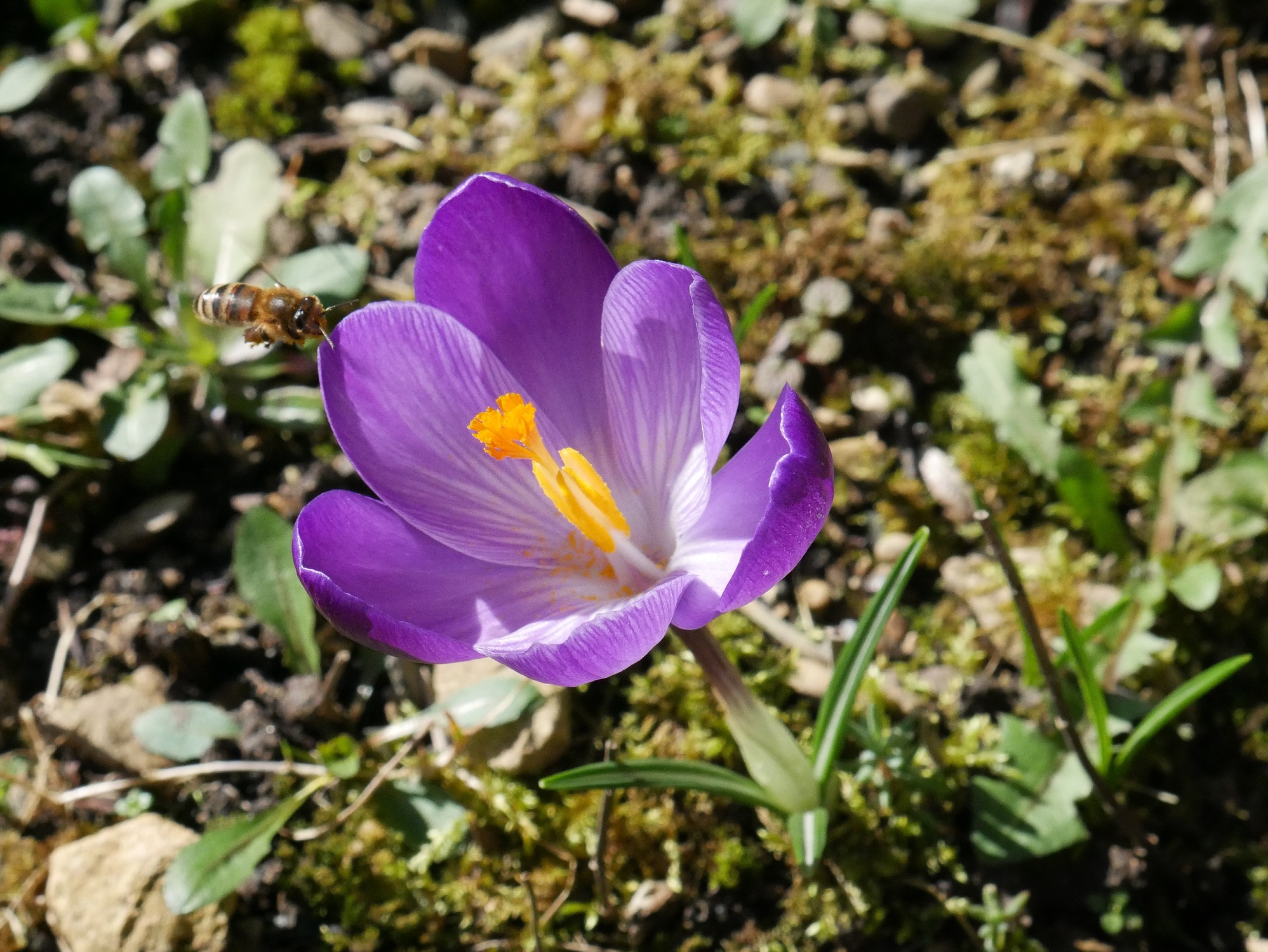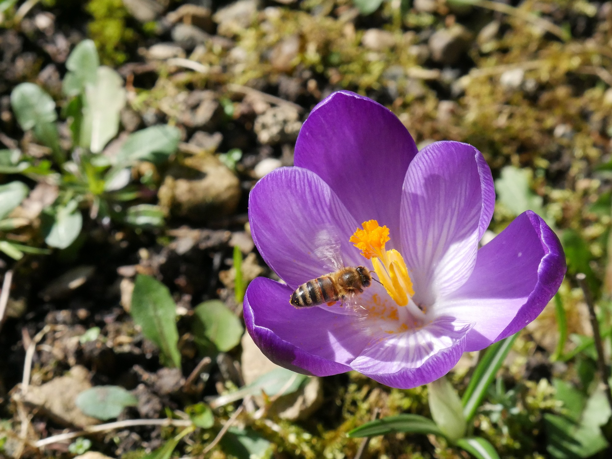 Première visite d'abeille sur les crocus, ça sent le printemps