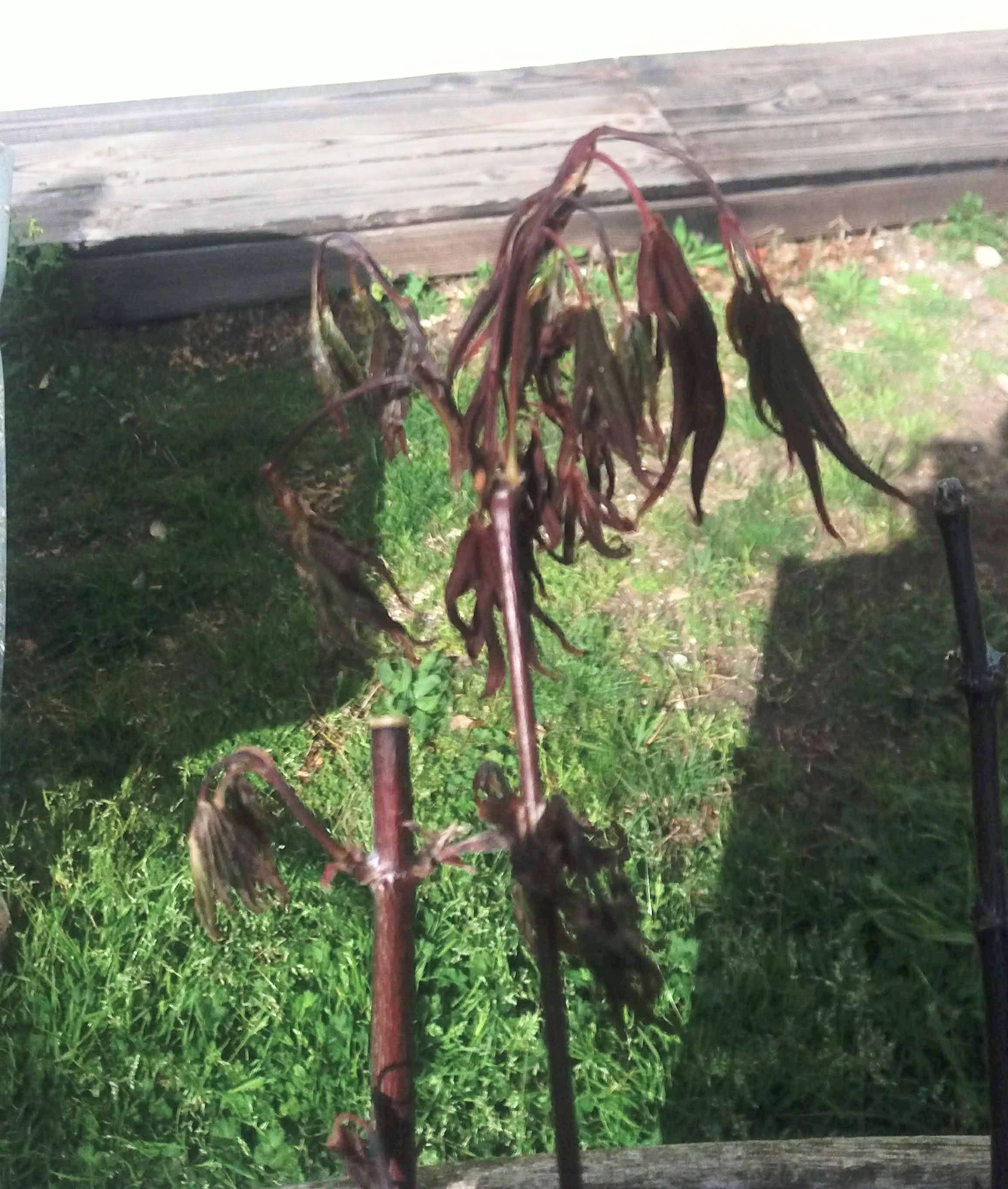 Un de mes nouveaux atropupueum après un débourrage correct a vu ses jeunes pousses piquer du nez comme suite àun coup de soleil ou de gel.