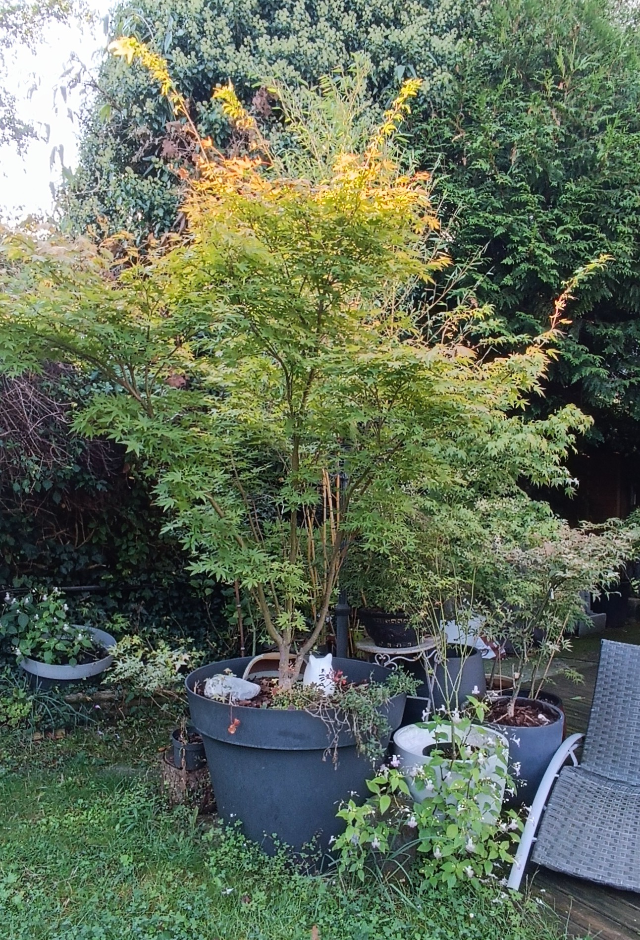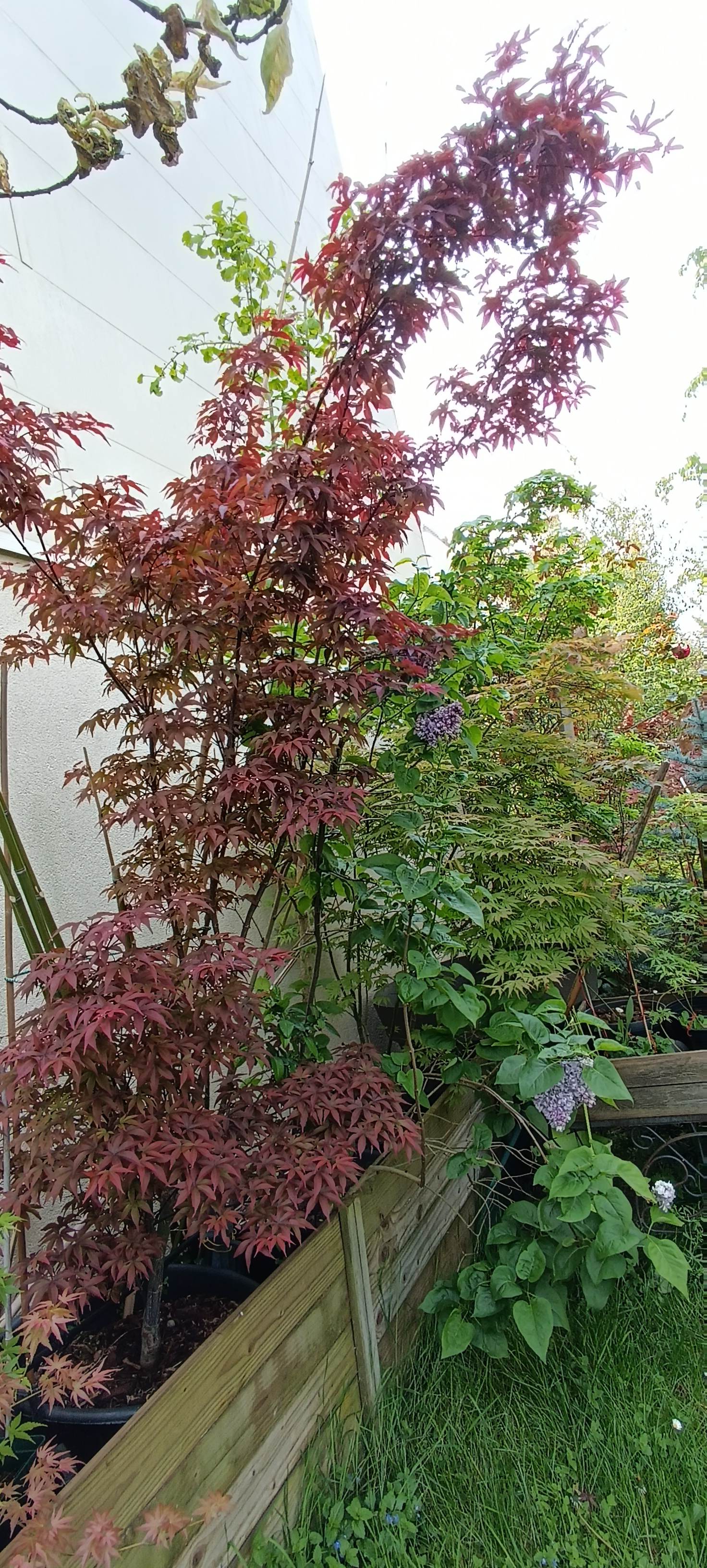 Ma vue préférée, bord de terrasse, le café du matin, soir etc. Semis de Arakawa (maillot) et grand atropurpurem de semis (cadeau de mes 40