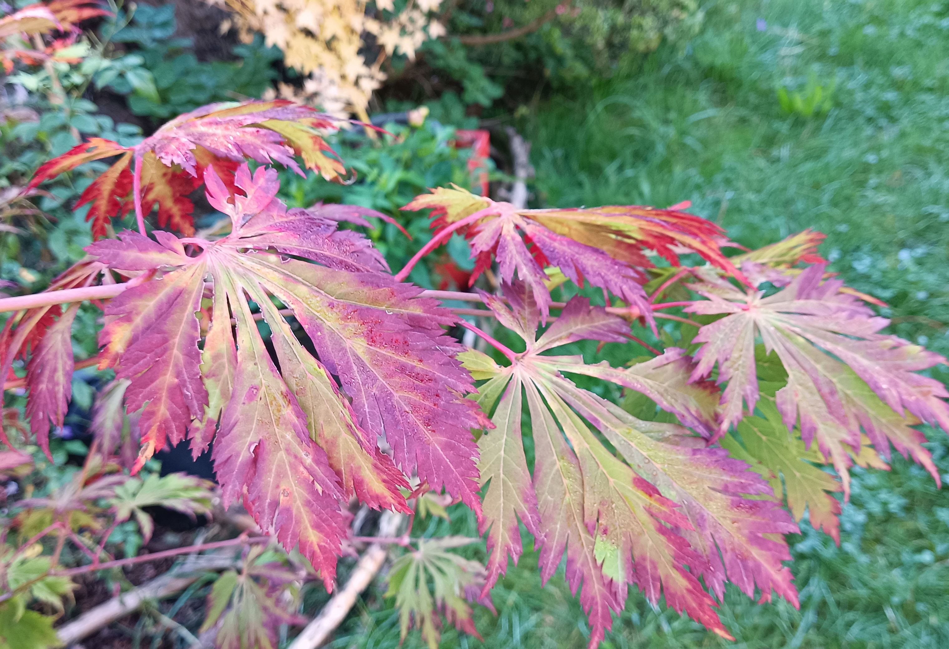 Orange dream, pleine terre, bouture, un de mes premiers érables. Feuillage presque intact, pas de pousse estivale, l automne devrait être au rdv. Le petit blanc en bas a gauche est un ukigomo, le moyen blanc au milieu geisha gone wild, et tout a gauche on devine un tamuke yama