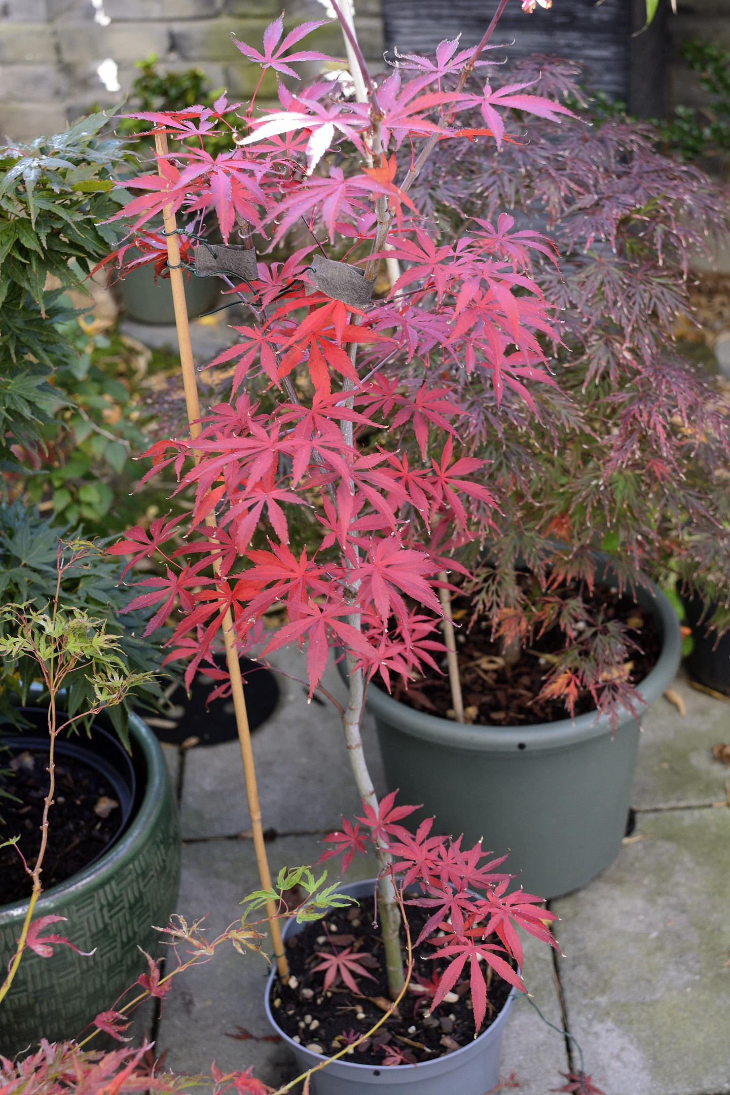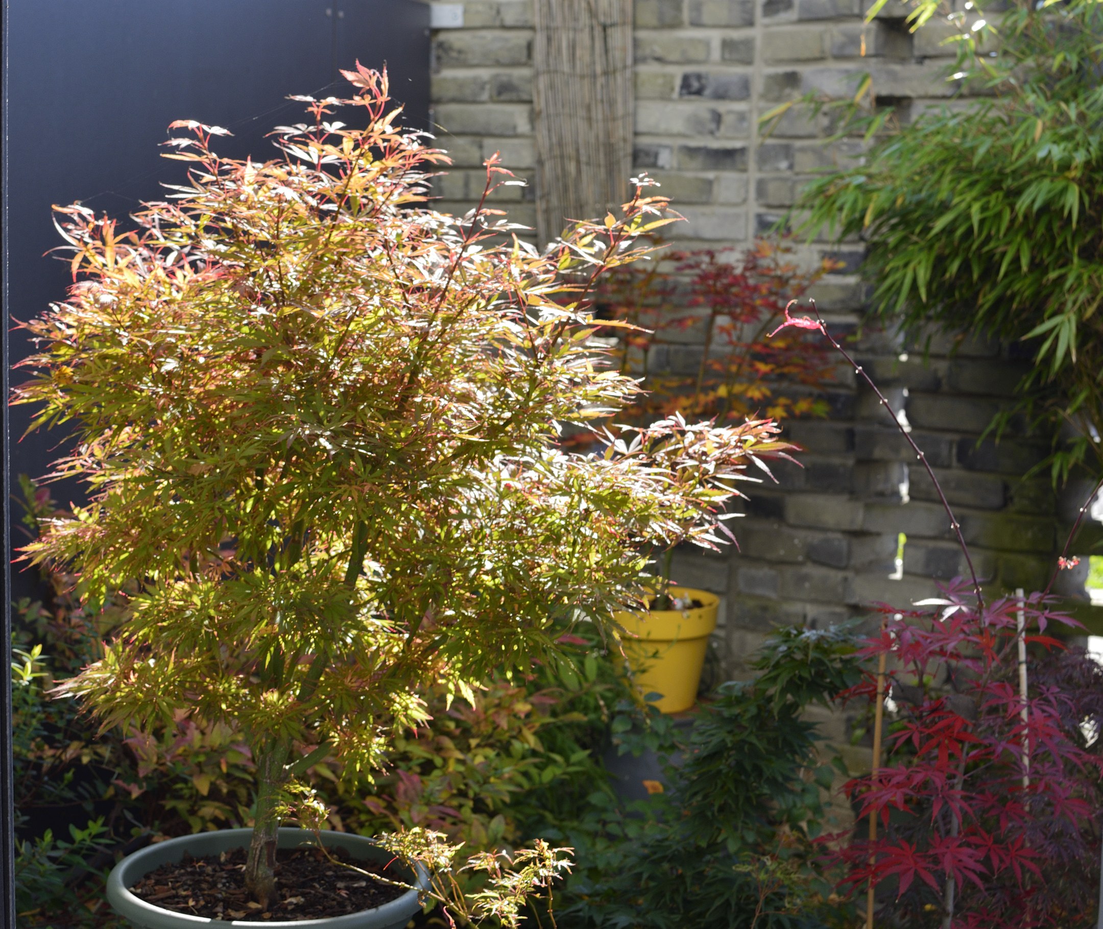 Sur cet ensemble de pot, osakazuki akame est sur la fin. Deux semaines et demi de couleurs. Aureum a eu de belles couleurs dans la semaine mais elles n ont pa duré. Avec la pluie ça a brunit et les feuilles tombent.