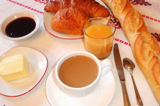 Je vous laisse le plateau du petit déj, boissons chaudes, jus multifruits, baguette craquante, beurre et confiture de cerises.