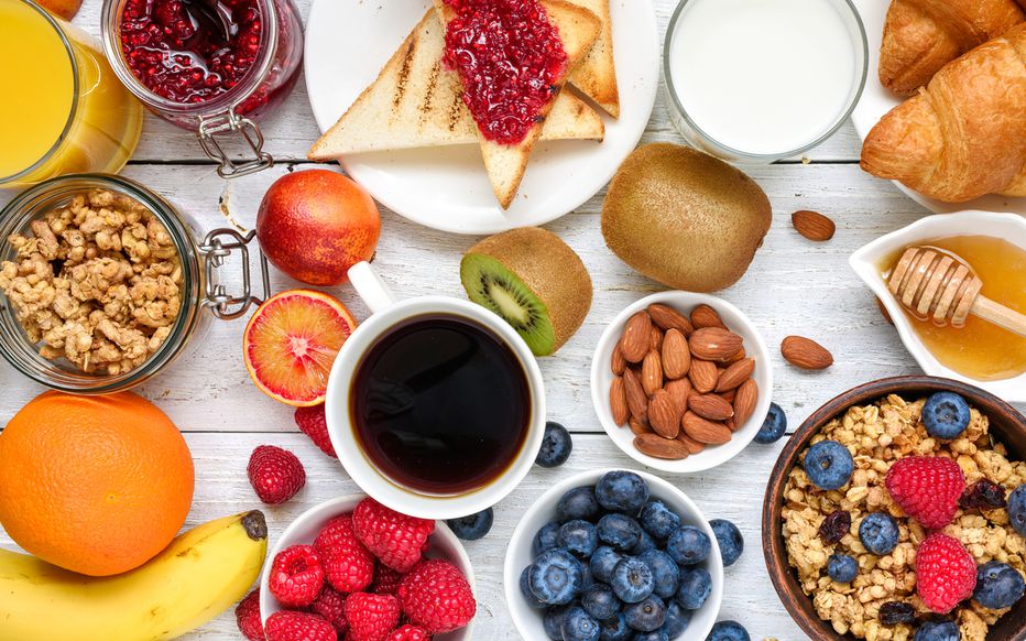 petit déjeuner du matin classique, pain frais, boissons chaudes , beurre et confiture.