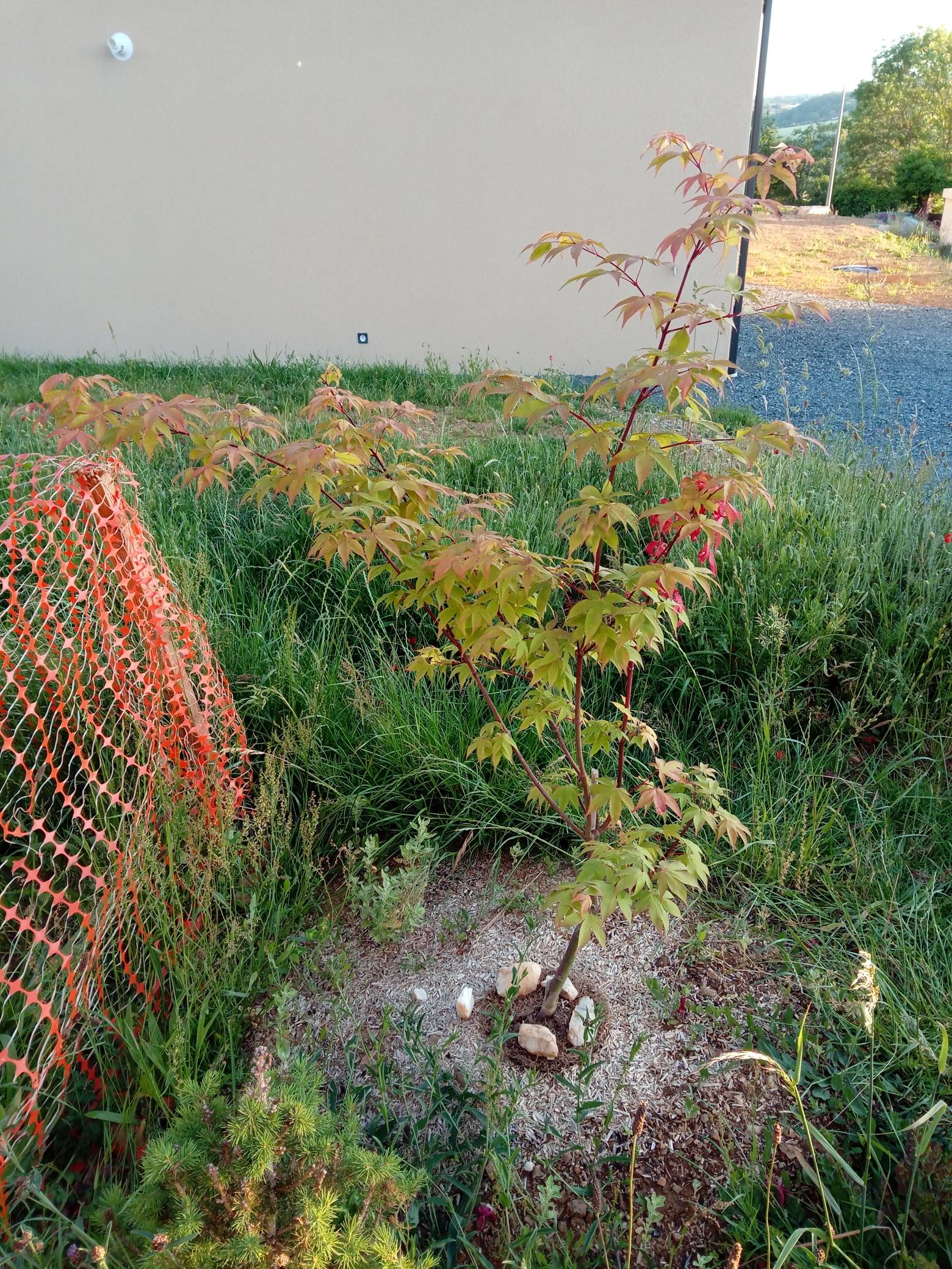 Ton Acer a l’air planté depuis peu de temps, il fait sa reprise. Peut-être abandonne t-il des racines pour en faire d’autres ?