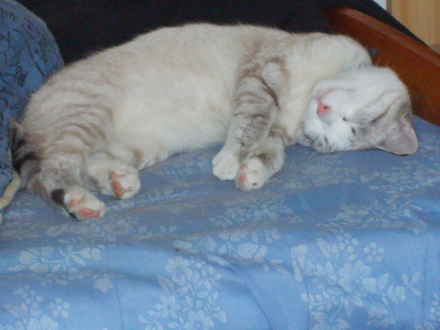 Le siamois est à elle c'est sûr mais l'autre je ne sais pas...je ne la vois pas.......le tigré n'est pas bien gras...je le remplume...jusqu'à quand???????????