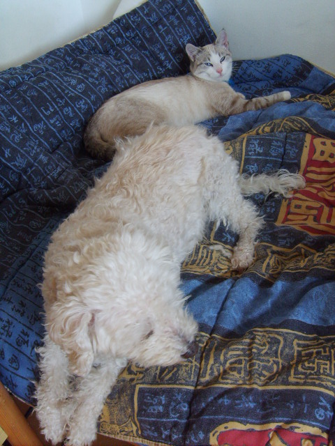 Vraiment ces deux minous se plaisent chez toi, tout comme ceux de Tigri.Tu lui a demandé si les chats sont bien a elle et ce qu'elle compte en faire.Pauvres petits, si elle ne s'en occupe pas, qui le fera? fait leur des petits câlins mais aussi àa tes deux adorables chiens :kiss: